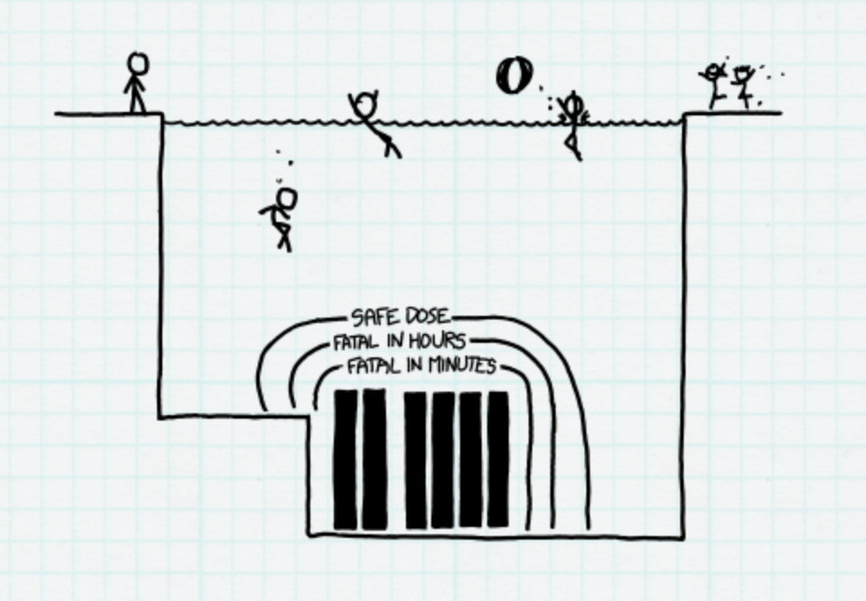 An excellent illustration of the effectiveness and relative safety of storing control rods in cooling pools comes from the webcomic XKCD (Fig2.). In What If, by the webcomic’s author Randall Munroe, he depicts how sufficient water is at stopping radiation from harming people. Water is so effective that it cuts radiation levels from nuclear fuel in half every 3 inches. That means that with just 6 feet of water between you and a highly radioactive fuel rod, you are receiving less radiation from the fuel rods than you are from natural background sources outside of the pool.