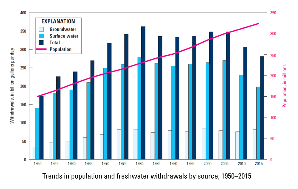 “Whiskey is for drinking, water is for fighting over,” Mark Twain purportedly quipped about the water policy discussions in the West. Unlike the wetter eastern U.S., much of the western U.S. is an arid place so conflicts over who gets water and how much are not new. But a surprising trend is that overall water use in the U.S. has actually decreased since the 1980s, despite a growing population. According to the U.S. Geological Survey, both conservation efforts and increases in efficiency have been responsible for the downward trend in groundwater and surface water withdrawals. That’s exciting because it means we are now using less water to support more people (and their lawns).