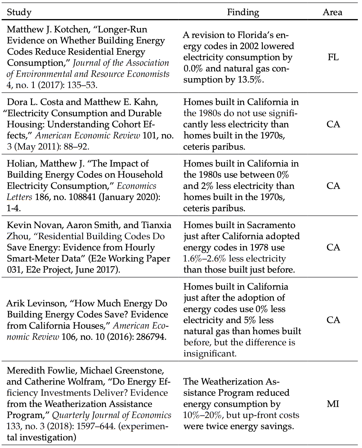 Arik Levinson argues not necessarily. Newer homes use less energy for reasons apart from their design, and Levinson argues Jacobsen and Kotchen conflate home vintage with home age.43Arik Levinson, “How Much Energy Do Building Energy Codes Save? Evidence from California Houses,” American Economic Review 106, no. 10 (2016): 286794. In his 2017 follow-up to the JK analysis, Kotchen finds evidence suggesting that Levinson was correct, with regard to electricity at least: Kotchen finds that energy codes were not responsible for reducing electricity demand.44Kotchen, “Longer-Run Evidence.” However, he does find that the savings from natural gas persisted and were twice as large as he and Jacobsen had found in their 2013 analysis.45Kotchen, “Longer-Run Evidence.”