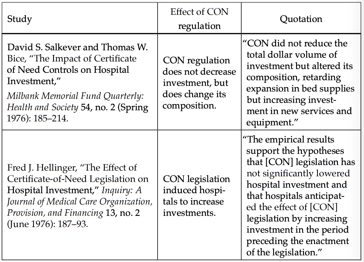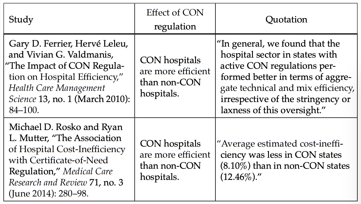 Stratmann et al. “Certificate-of-Need Laws: How CON Laws Affect Spending, Access, and Quality across the States.” Mercatus Center at George Mason University. August 29, 2017. Accessed February 15, 2020. https://www.mercatus.org/publications/corporate-welfare/certificate-need-laws-how-con-laws-affect-spending-access-and-quality.