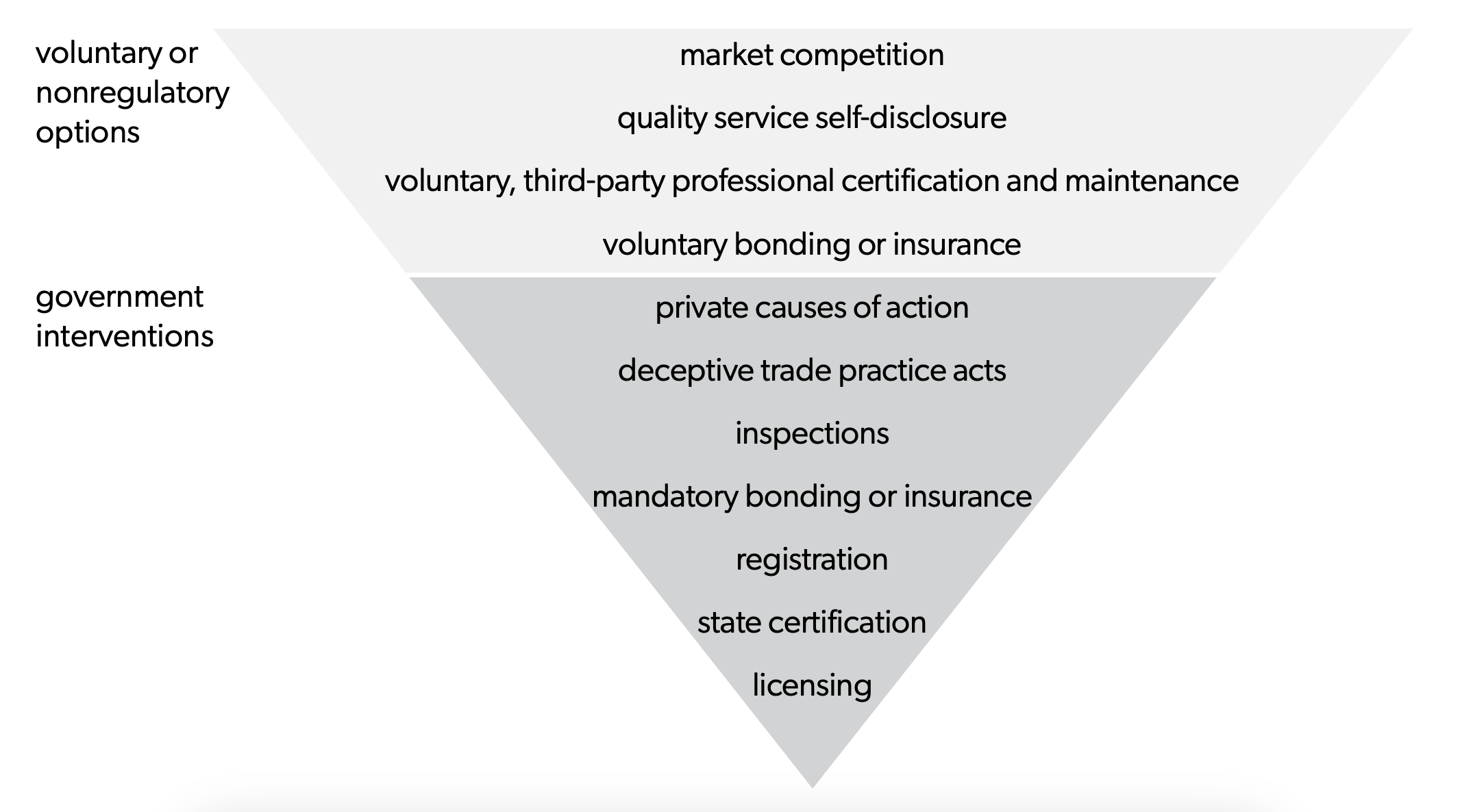 The Institute for Justice has identified additional alternatives to occupational licensing besides certification and registration.25John K. Ross, “The Inverted Pyramid: 10 Less Restrictive Alternatives to Occupational Licensing” (report, Institute for Justice, November 2017). Figure 1 shows the “inverted pyramid” depicting alternative forms of regulation—beginning with the least-restrictive option at the top (market competition) and the most-restrictive option at the bottom (occupational licensing). The shape of the inverted pyramid represents the restrictiveness of a form of occupational regulation—a larger area within the pyramid corresponds with more freedom for the market to function without restriction.