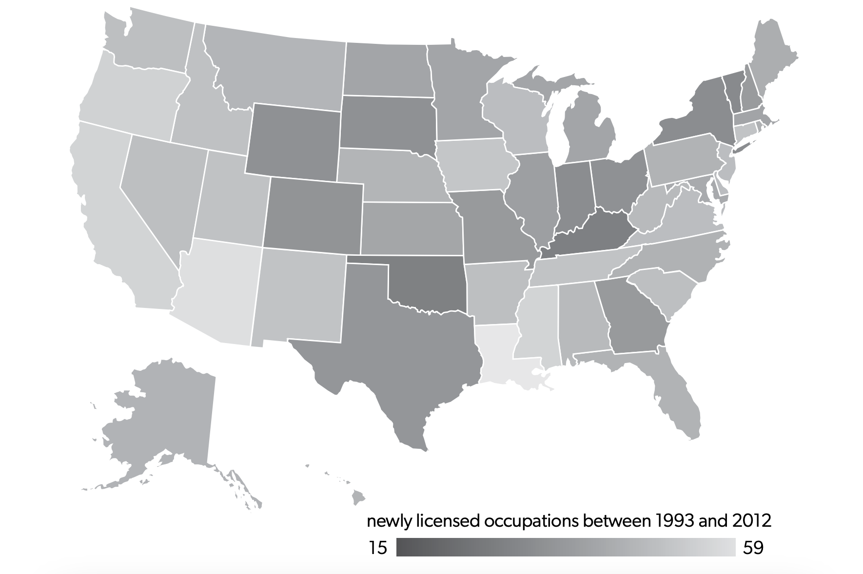 Figure 2 reproduces the original map of growth in licensed occupations from that 2018 study. Growth in the 1990s and shortly after the turn of the century was not limited to a single geographic region, and states differed drastically in the number of new occupational licenses they enacted—from a low of 15 in Kentucky to 59 in Louisiana. We also found that within the 1993–2012 period occupational licensing is associated with substantial negative effects on economic mobility within states.