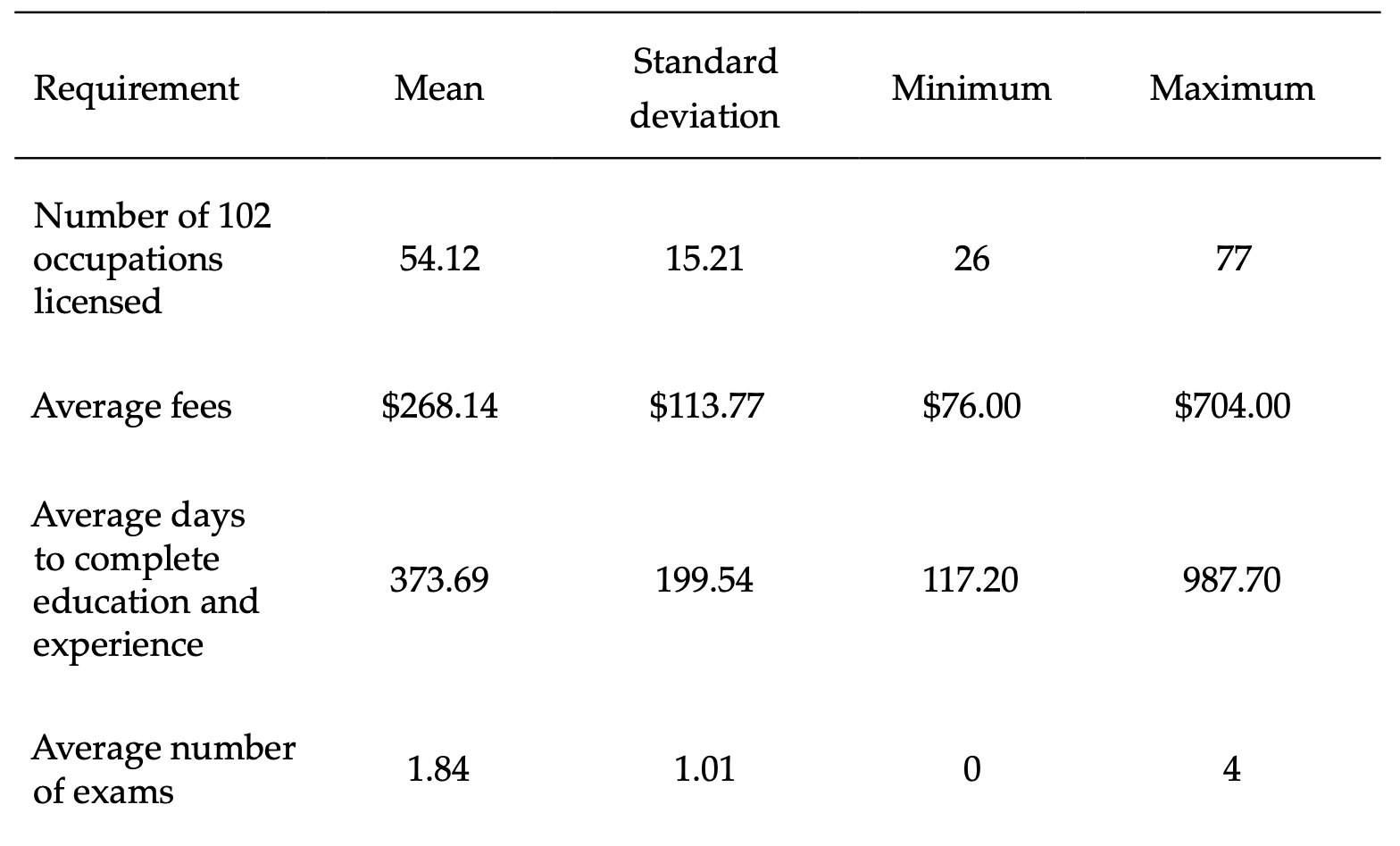 Table 1 also contains information on the number of the 102 occupations that are licensed within each state, the number of exams required to obtain a license, and the days required to complete mandated training and experience.