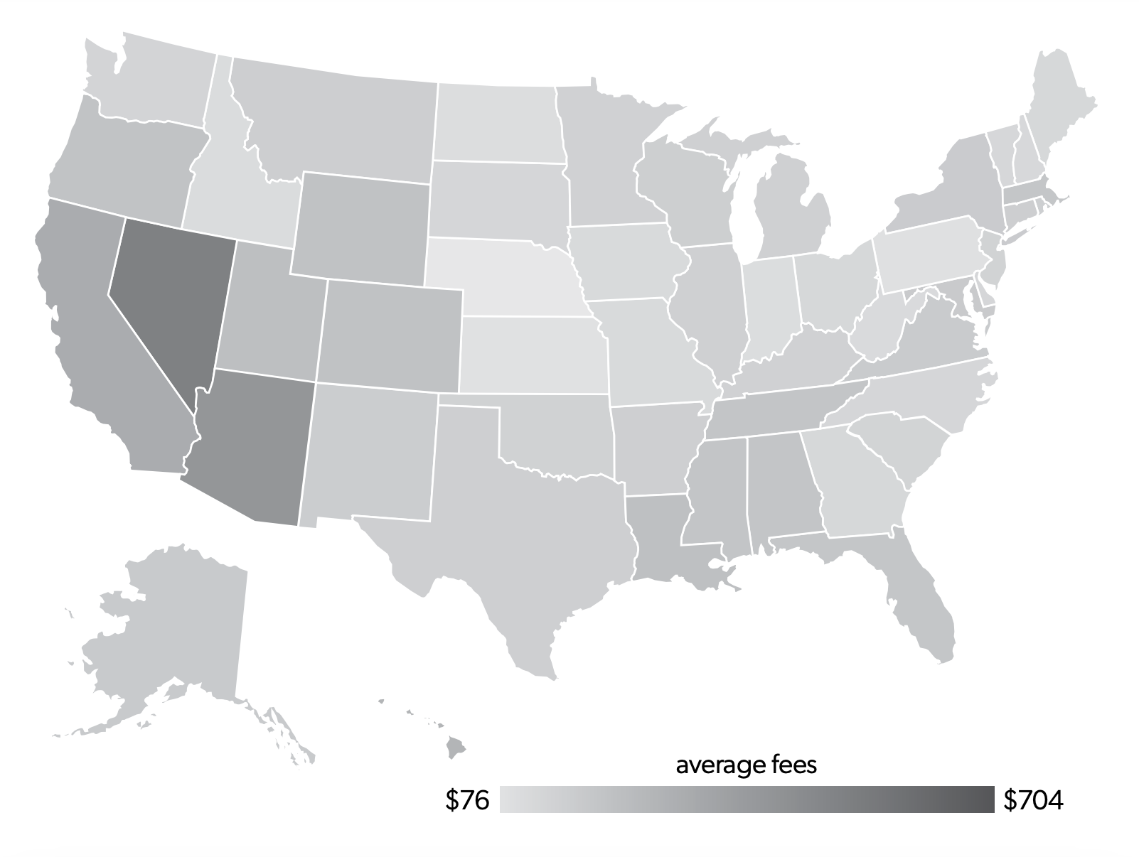 Table 1 presents summary statistics for occupational licensing costs across states for the 102 occupations included in the 2017 LTW update. One of the most notable and well-known costs of occupational licenses are fees. Comparing average fees is not the perfect way to capturing state variation, but it does provide a rough sketch of the regulatory environment. Figure 3 depicts the average fees to acquire a license in each state, and these vary drastically. Nevada is the most expensive state—on average, an occupational license costs $704. In Nebraska, the least expensive state, the average fee is $76. The average cost of a license across all states is $268.14; approximately two-thirds of states have averages within $113.77 above or below this average.