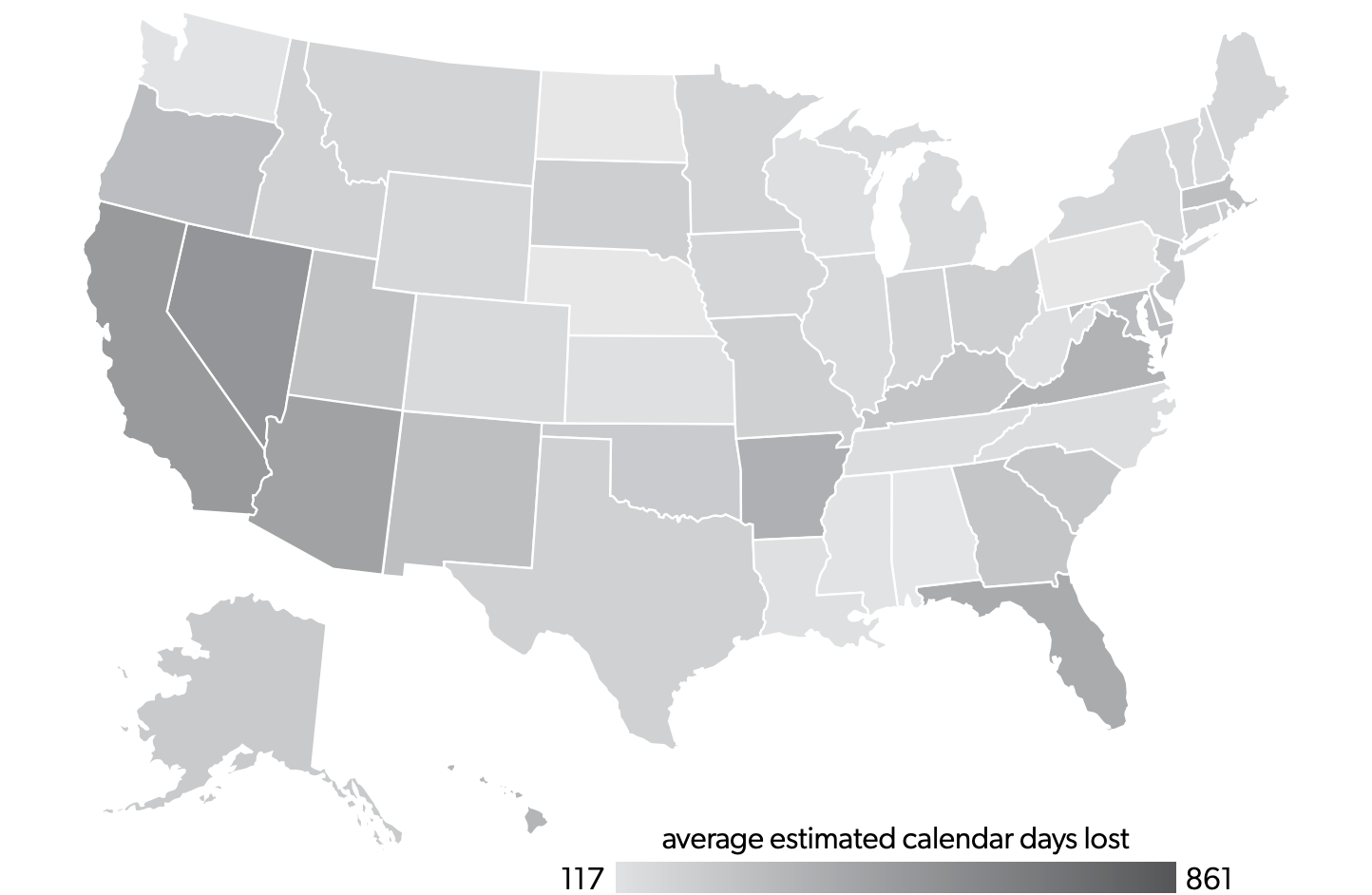 Figure 4 is a map depicting the length of time mandated to fulfill licensing requirements. One of the first interesting things to note is the similarities between average fees (figure 3) and education requirements (figure 4), since these measures tend to be correlated and if a state has a high cost in one, it often has a high cost in both. The amount of time needed to complete the education and experience requirements for a license in the United States, in 2017, averaged 373.69 days, or slightly over a year. The length of time necessary to fulfill these requirements can vary widely, from 117.20 days on average in Pennsylvania to 987.70 days in Hawaii (almost three years).