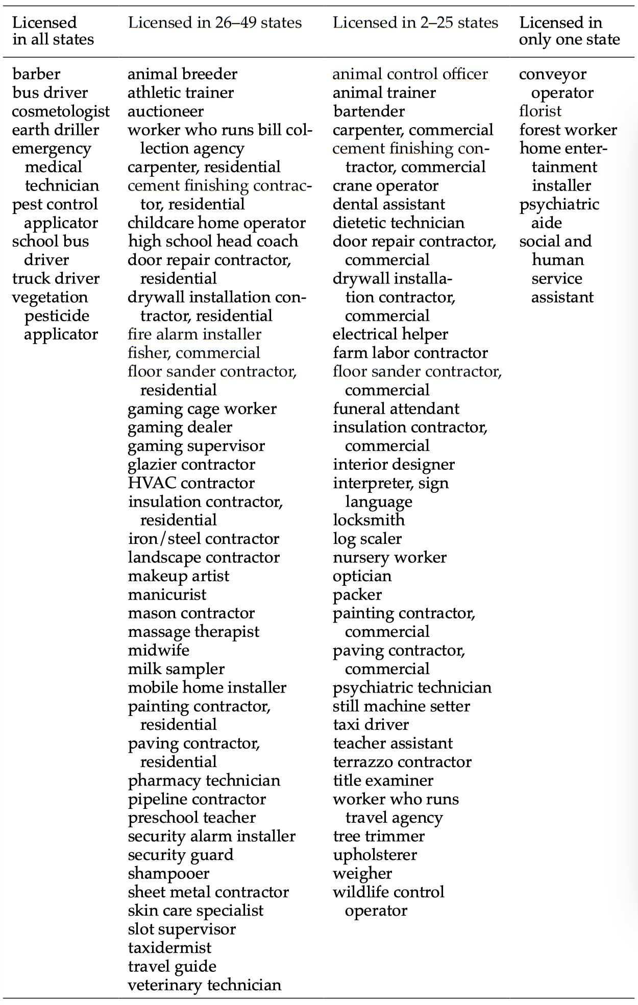This section considers only occupations that are subject to licensing, meaning that workers require government authorization to provide their services legally, in all or a subset of states. As an illustrative example, consider emergency medical technicians (a universally licensed occupation) and bartender. In every state, emergency medical technicians must have government permission to practice emergency medical response and to transport patients by ambulance to medical facilities, and it would be illegal for someone to perform these actions without authorization. On the other hand, in 38 states bartenders may obtain a voluntary certification to serve alcohol, but this certification is not required in any state and individuals can operate in this capacity without the certification.