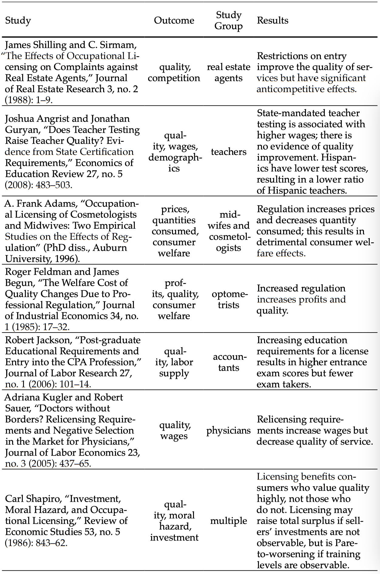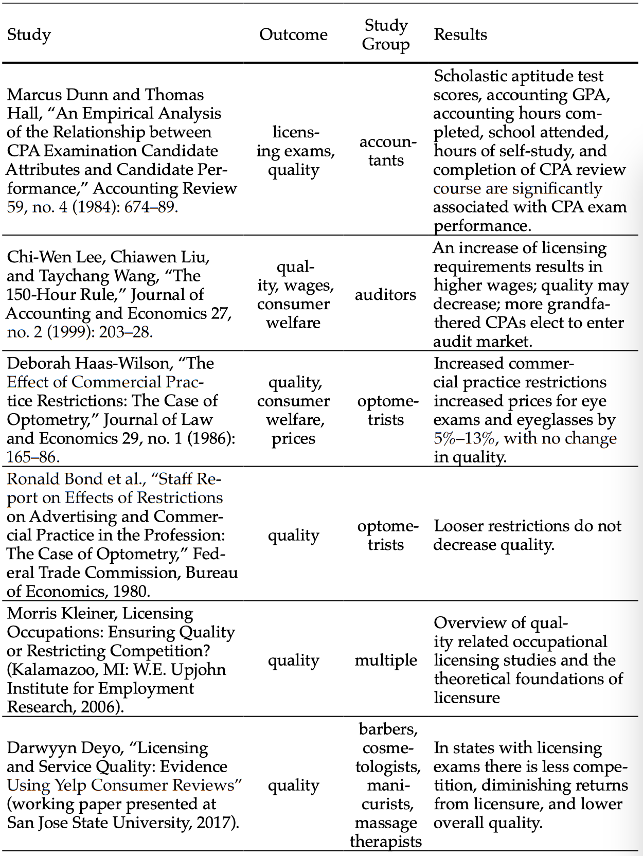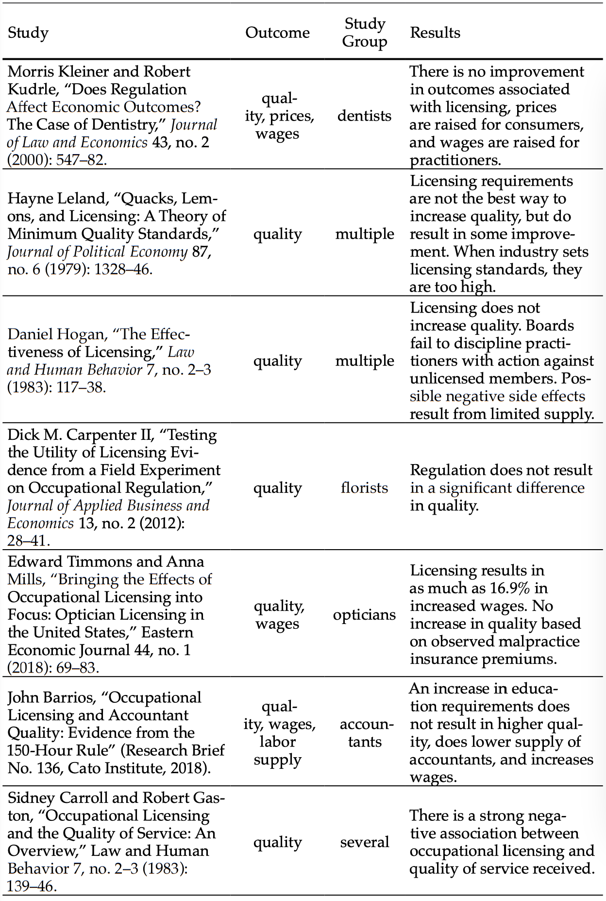 Carroll, Sidney and Robert Gaston. “Occupational Licensing and the Quality of Service: An Overview.” Law and Human Behavior 7, no. 2–3 (1983): 139–46.