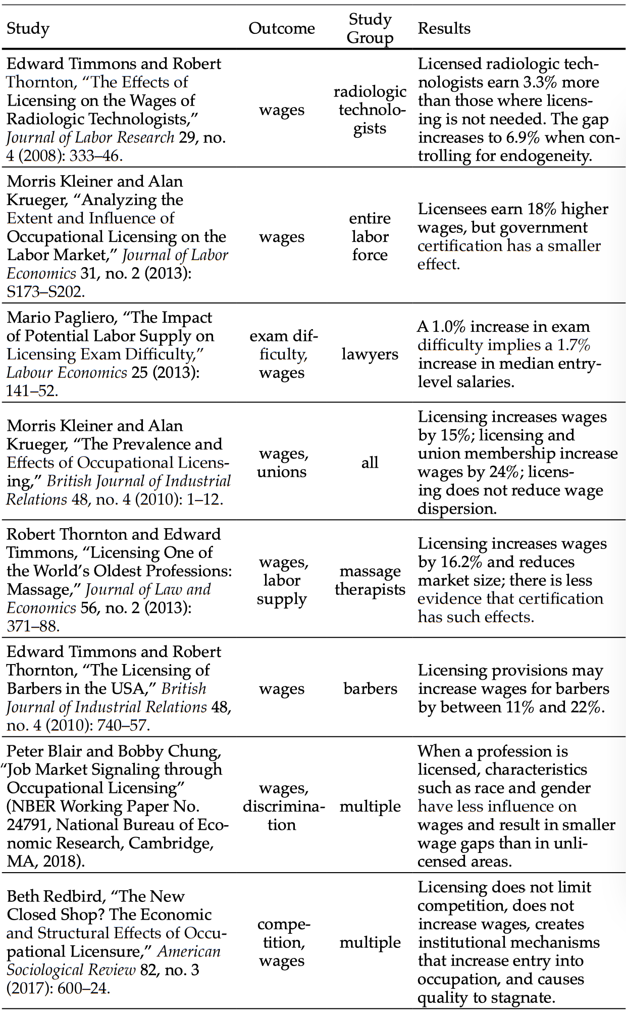 Kleiner, Morris and Alan Krueger. “The Prevalence and Effects of Occupational Licensing.” British Journal of Industrial Relations 48, no. 4 (2010): 1–12.