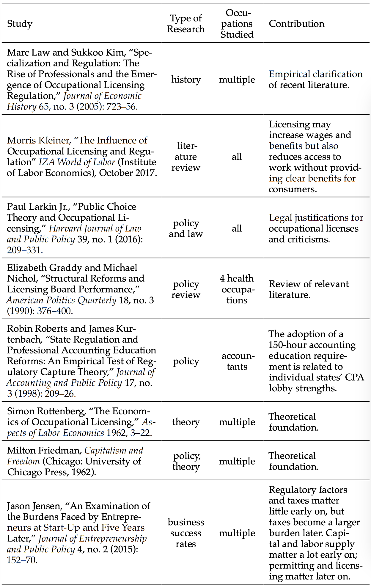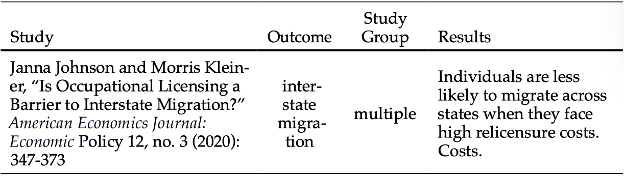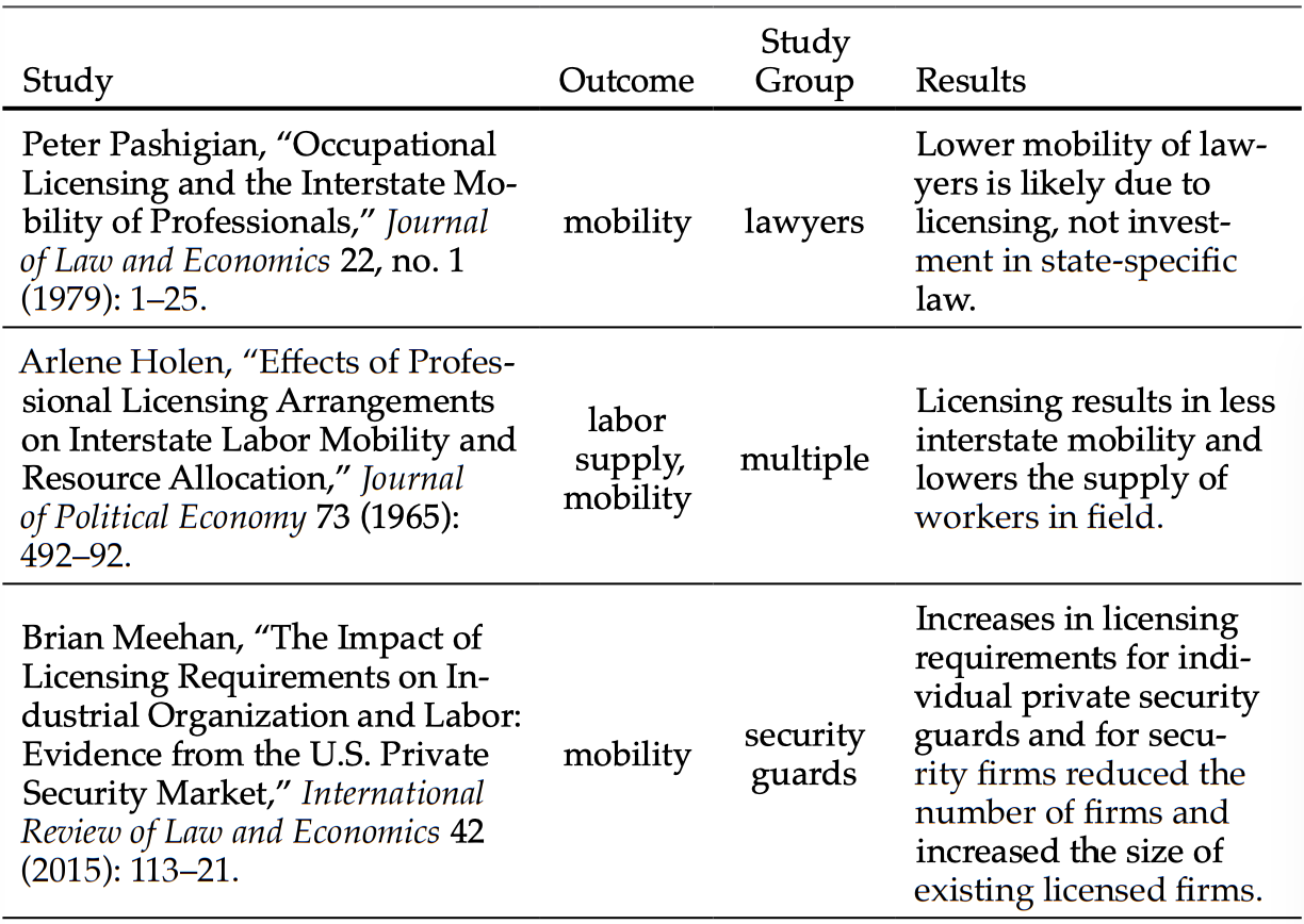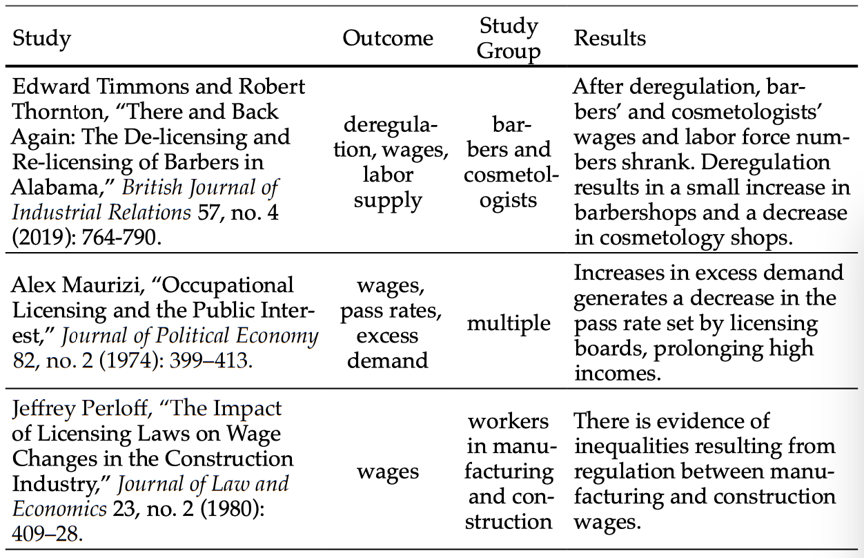 Appendix: Table of Occupational Licensing Studies