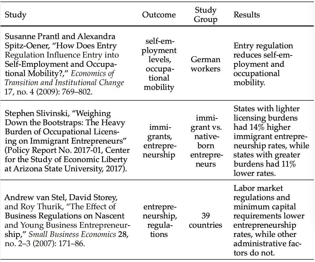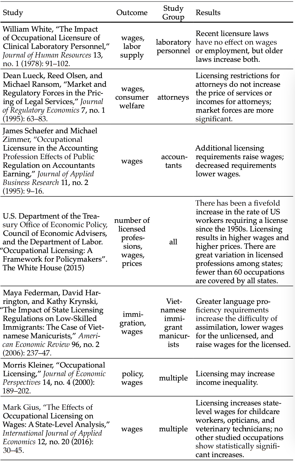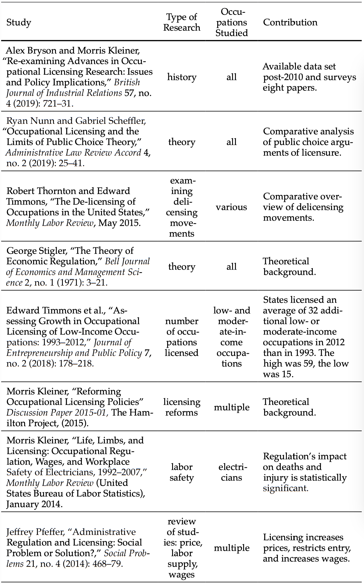 Appendix: Table of Occupational Licensing Studies