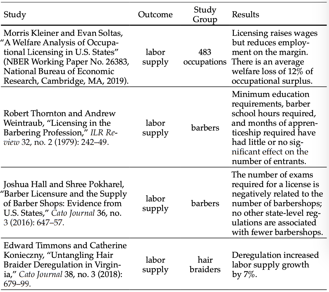 Kleiner, Morris and Evan Soltas. “A Welfare Analysis of Occupational Licensing in U.S. States” (NBER Working Paper No. 26383. National Bureau of Economic Research. Cambridge, MA. 2019).