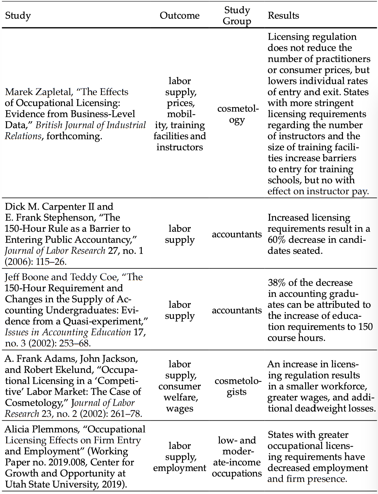 Adams, A. Frank, John Jackson, and Robert Ekelund. “Occupational Licensing in a ‘Competitive’ Labor Market: The Case of Cosmetology.” Journal of Labor Research 23, no. 2 (2002): 261–78.