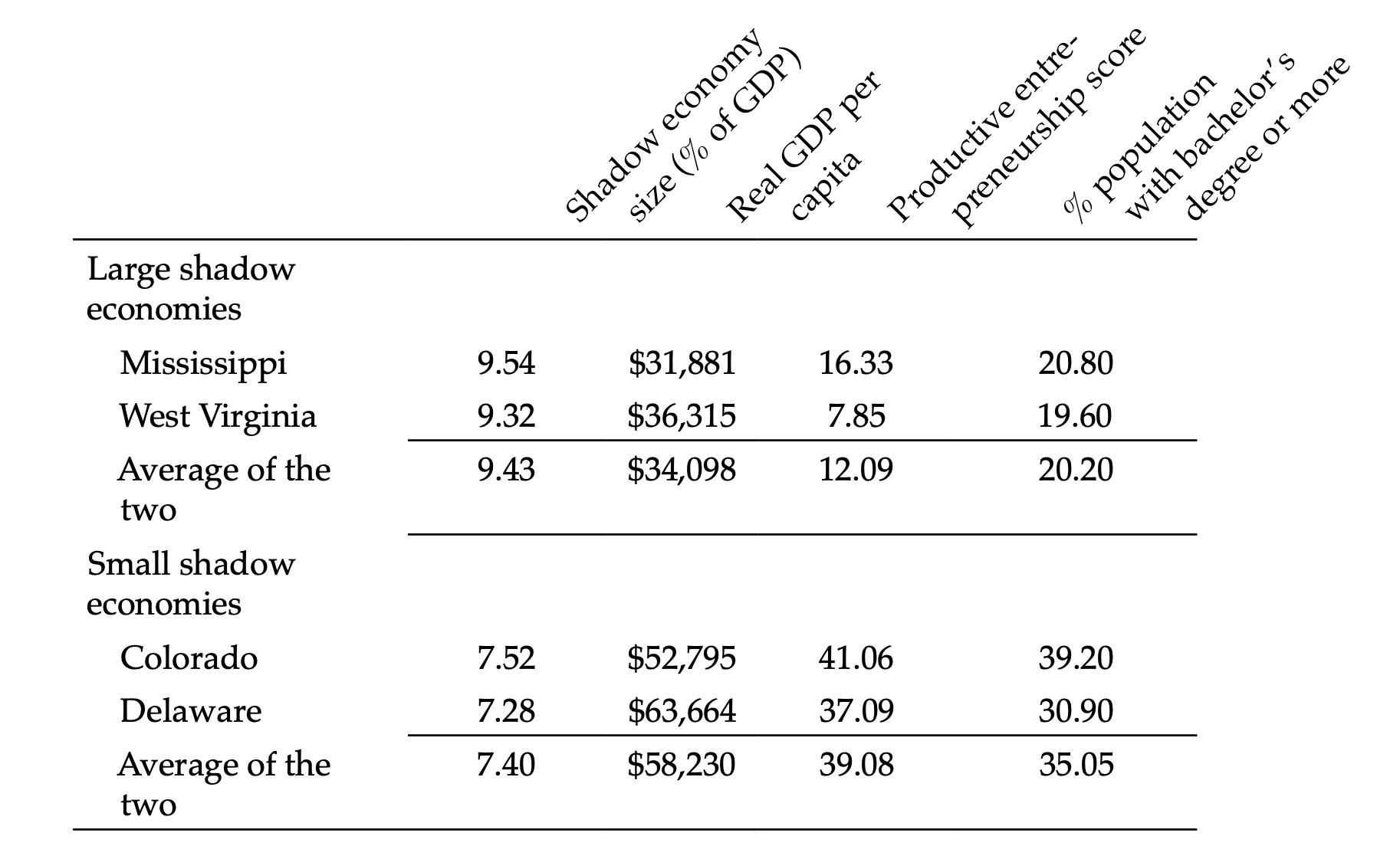 Additionally, for comparison, table 1 shows the record of wealth and well-being in Mississippi, West Virginia, Colorado, and Delaware, relative to shadow economy size. Averages of all estimates are provided to demonstrate the remarkable differences in important indicators, such as the states’ real GDP per capita (of legally reported activities), productive entrepreneurship scores,24Productive entrepreneurship scores come from my index of Productive and Unproductive Entrepreneurship Scores and are based on state-level per capita venture capital investments, patents per capita, self-proprietorship (self-employment) growth rates, establishment birth rates, and large establishment (500 employees or more) birth rates. The index offers a 48-point productive entrepreneurship scale, increasing in greater percentages of productive activity. Travis Wiseman and Andrew Young, “Religion: Productive or Unproductive,” Journal of Institutional Economics 10, no. 1 (2014): 421-33. and educational attainment at the bachelor degree level or higher. The states with smaller shadow economies have, on average, a more highly educated population (35.05% with bachelor’s degrees versus 20.20%), experience more formal-sector productive entrepreneurship (an average score of 39.08 versus 12.09), and realize a higher real per capita GDP ($58,230 versus $34,098).