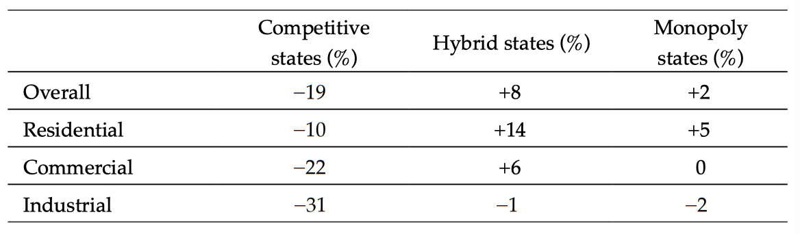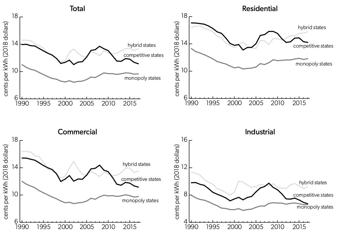 The studies comparing monopoly and competitive states generally find that competition is associated with at least small price reductions for residential customers. Some of these studies find no change in commercial or industrial rates, but one study finds that commercial and industrial rates fell too.31Giberson and Wardle, “Consequences of Retail Electric Choice,” 15–17.