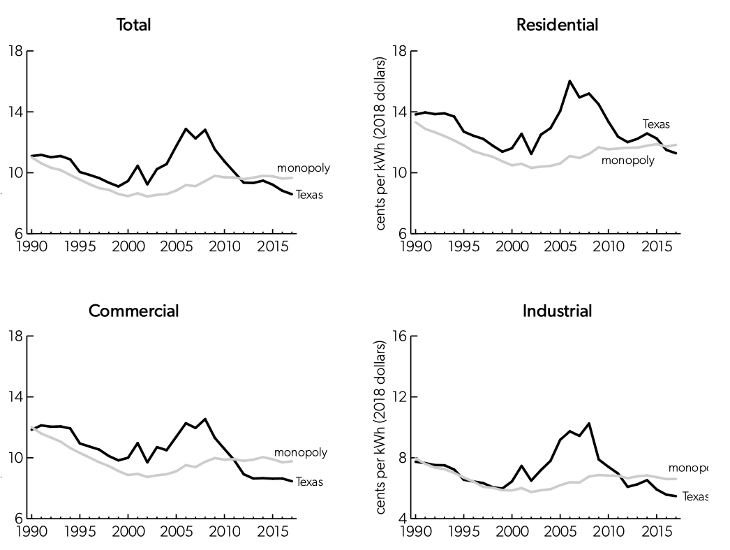 An accurate assessment of the effects of competition requires a comparison of prices paid in competitive markets to a relevant counterfactual estimate of what the prices would have been in the absence of competition.30L. Lynne Kiesling, “Retail Restructuring and Market Design in Texas,” in Electricity Restructuring: The Texas Story, ed. L. Lynne Kiesling and Andrew N. Kleit (Washington, DC: AEI Press, 2009), 171–72. Two types of scholarly studies attempt to identify a relevant counterfactual by controlling for other factors that could increase electricity prices. Some compare price trends in competitive and monopoly states after controlling for other factors that influence prices. Others focus on the pattern of prices over time in a single state.