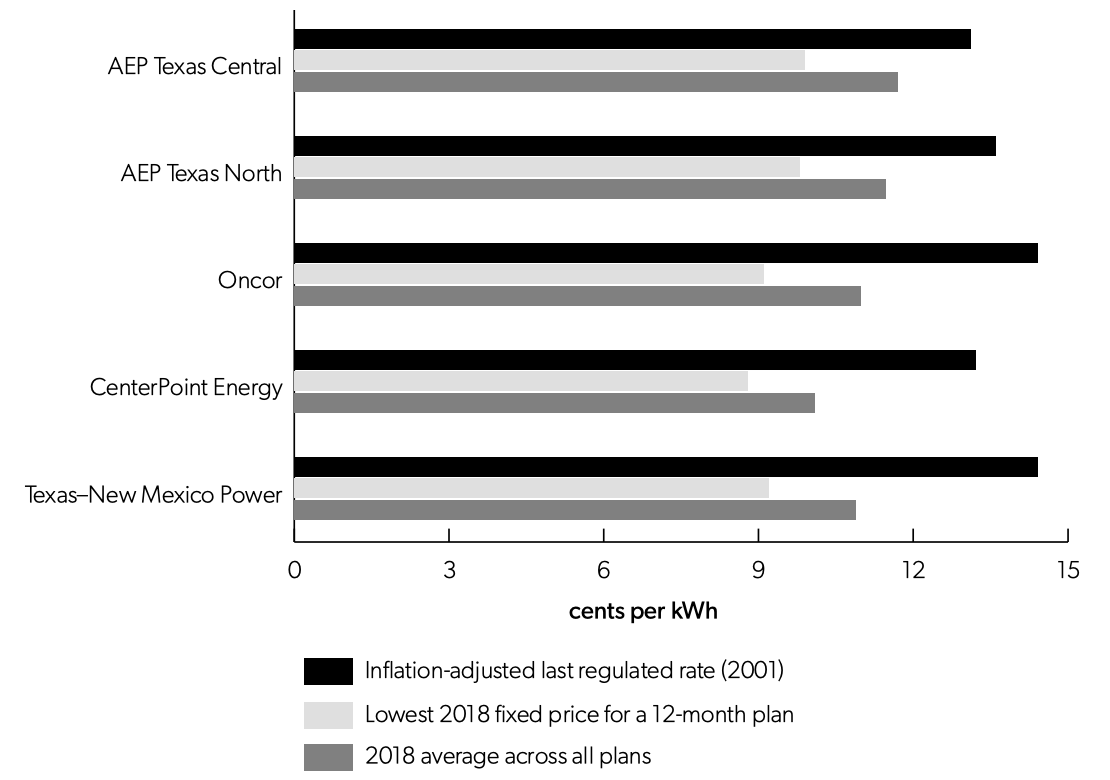 Every two years, the Public Utility Commission of Texas produces a report for the Texas legislature on competition in the electric industry. Figure 3 shows that in 2018, the average price for residential power plans in all five ERCOT distribution regions was between 10 and 24 percent below the last regulated price. The least expensive 12-month fixed price plan offered even larger savings.