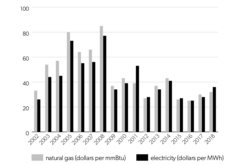 In California, prices spiked owing to supply shortages and manipulation of the wholesale power market in 2001 and 2002. These California price spikes largely account for figure 1’s spikes in the weighted average price of electricity in the hybrid states for those years. The competitive states experienced price increases later, between 2002 and 2008. These increases largely reflect the fact that the price of natural gas more than doubled during this period, from $3.32 per million British thermal units (mmBtu) in 2002 to $8.50 per mmBtu in 2008.262018 State of the Market Report for the ERCOT Electricity Markets (Fairfax, VA: Potomac Economics, June 2019), 5.