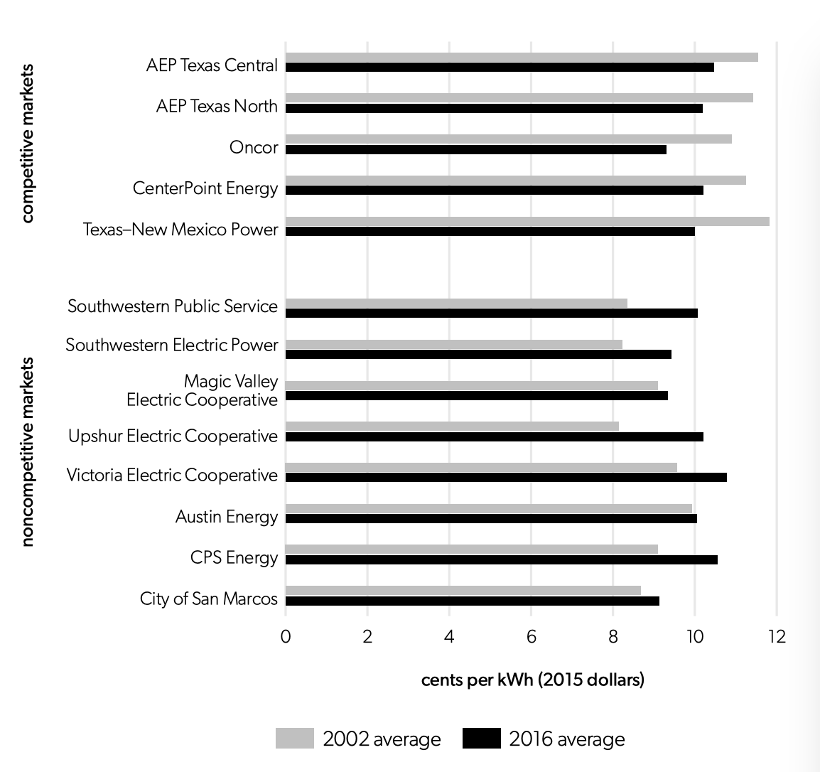 An econometric study using more recent data finds that retail prices more closely reflect marginal costs in the state’s competitive markets than in the monopoly markets. The econometric analysis covers the years 2002–2016 and examines pricing trends for customers using 1,000 kilowatt-hours (kWh) of power per month. The authors analyzed factors that affect prices in the five competitive regions of ERCOT and eight noncompetitive markets: the territories served by two investor-owned utilities, three co-ops, and three municipal utilities. In all five competitive regions, retail residential prices are positively correlated with the wholesale price of power and utility wages. In other words, retail prices vary with marginal costs, as one would expect in a competitive market. Retail prices are positively correlated with wholesale electricity prices in only three of the noncompetitive markets and positively correlated with wages in only one of the noncompetitive markets.53Peter R. Hartley, Kenneth B. Medlock III, and Olivera Jankovska, “Electricity Reform and Retail Pricing in Texas,” Energy Economics 80 (2019): 1–11.