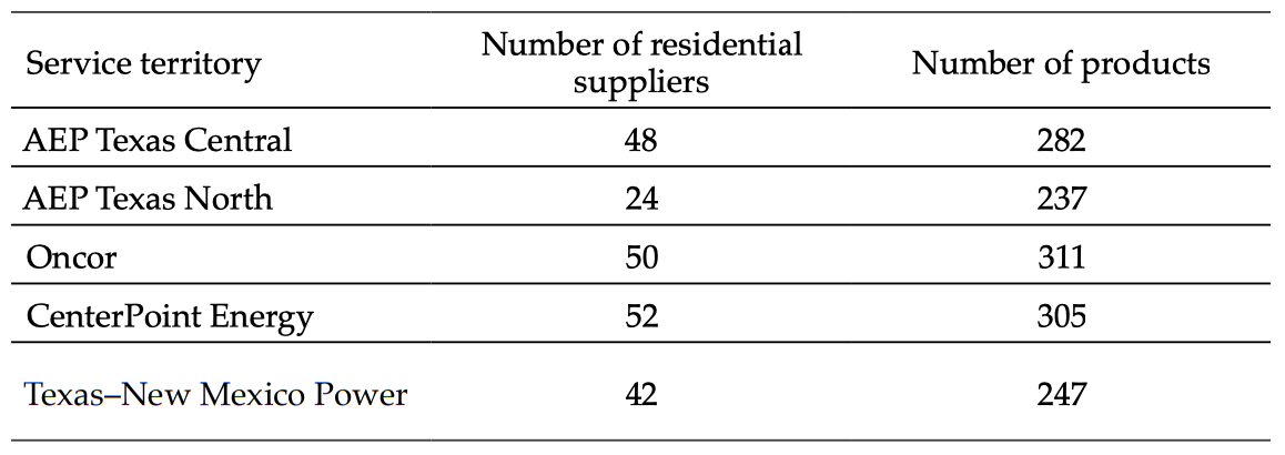 Source: Table 1 in Peter R. Hartley, Kenneth B. Medlock III, and Olivera Jankovska, “Electricity Reform and Retail Pricing in Texas,” Energy Economics 80 (2019): 7.