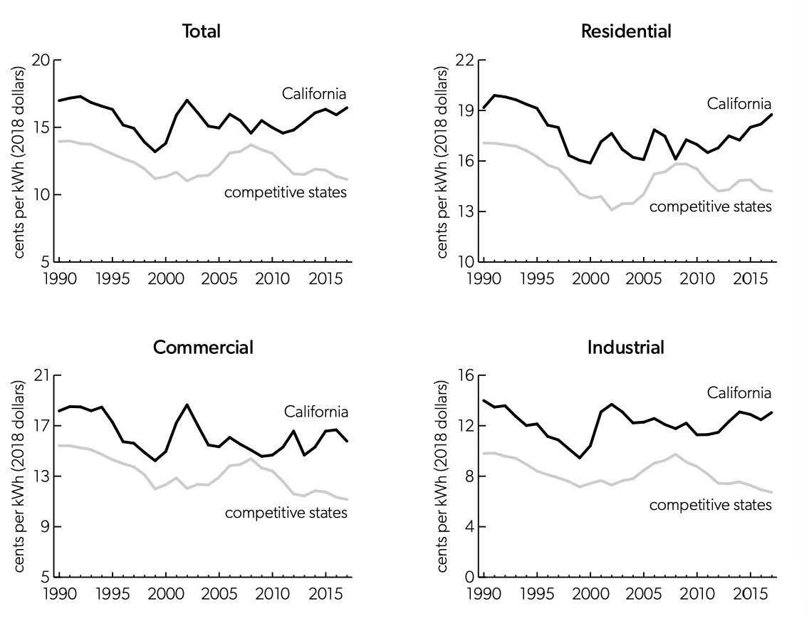 Figure 6 shows that California’s electricity prices have always been substantially higher than the prices in the states where retail competition currently exists. Prices fell steadily until 1998 or 1999, then rose modestly for a year or two. Prices spiked in 2001 and 2002, especially for commercial and industrial customers. California prices began to rise after 2008 for residential customers and after 2010 for commercial and industrial customers. Prices in states with retail competition began a steady decline after 2008.