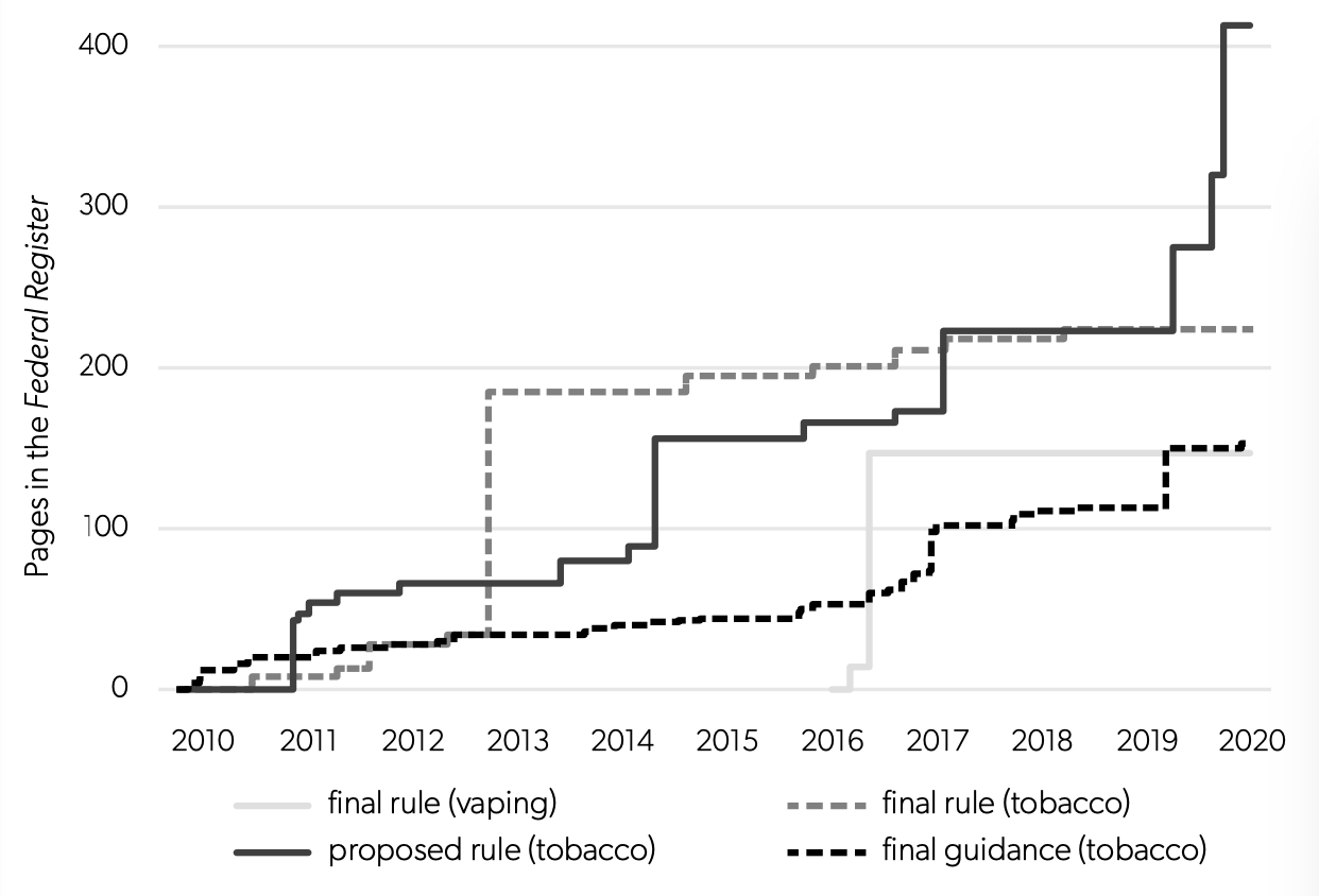 The entering wedge for direct federal regulation of tobacco as a consumer product came in the form of Family Smoking Prevention and Tobacco Control Act of 2009, which granted the FDA authority to regulate tobacco products. The FDA’s first action under the act was to issue a rule in 2010 prohibiting the sale of cigarettes and smokeless tobacco to any person under age 18. (Such sales were already illegal in all states.)15See Regulations Restricting the Sale and Distribution of Cigarettes and Smokeless Tobacco to Protect Children and Adolescents, 75 Fed. Reg. 13225 (March 19, 2010). The rule was a revised version of a 1996 FDA rule that was ultimately voided by the Supreme Court, which ruled in 2000 that the FDA lacked the authority to regulate tobacco as a drug. FDA v. Brown & Williamson Tobacco Corp. (98-1152), 529 U.S. 120 (2000), 153 F.3d 155, affirmed. Since that time, there has been a steady flow of proposed and final rules and “guidance” from the FDA regarding tobacco regulation. Figure 1 shows the growth of federal regulation regarding tobacco over time, as measured by the cumulative number of pages of rules in the Federal Register. By 2015, there were over 200 pages of binding regulations, and by the beginning of 2020 there were 224 pages of rules, more than 150 pages of guidance regarding those rules, and well over 400 accumulated pages of proposed rules. The pages of proposed rules nearly doubled in 2019 with recent actions by the FDA (about which more will be said below).