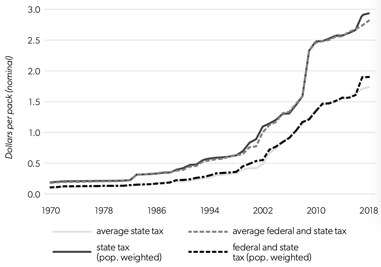 Thus it is unsurprising that studies taking these considerations into account while computing the optimal tax to account for fiscal externalities alone generally find that current excise tax levels are too high compared to the net externalities.37It is also important to note that studies (such as those cited in note 35) were reaching such conclusions well before the recent rounds of increases in tobacco taxes. See figure 2. Even using an astronomically high figure for the health cost to society of smoking a single pack ($35), the optimal tax to correct for negative externalities would be only 40 cents per pack (compared to the actual excise tax, which averaged around $2.80 in 2018).38For the average tax rate, see figure 2; for the study, see Jonathan Gruber and Botond Köszegi, A Modern Economic View of Tobacco Taxation (Paris: International Union against Tuberculosis and Lung Disease, 2008). This estimate of the net negative externality does not include any harmful effects of secondhand smoke. The weight of the literature instead finds similarly small externalities, but some notable exceptions actually find social savings from smoking (although these tend to be in countries with higher public expenditures on health than the United States).39Sijbren Cnossen, “Tobacco Taxation in the European Union,” FinanzArchiv/Public Finance Analysis 62, no. 2 (2006): 305–22.