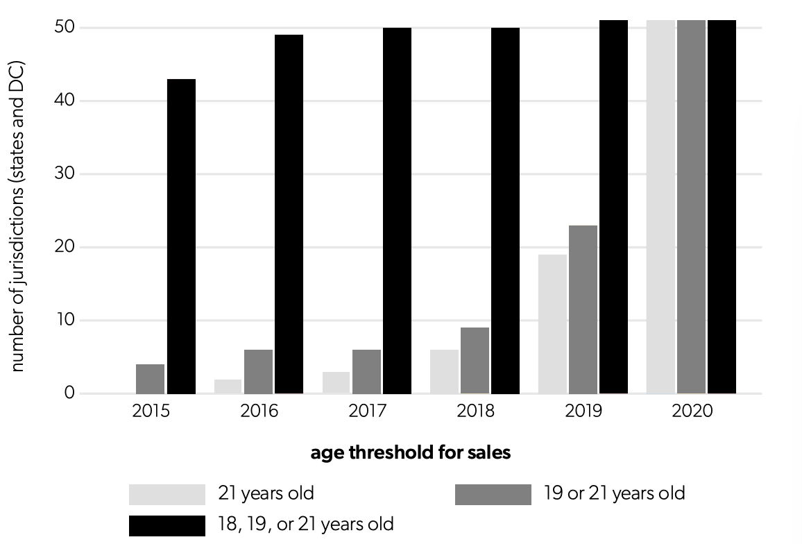 The first federally mandated restrictions on where one could smoke came in the late 1980s, with bans on smoking on certain domestic airline flights.10Pub. L. No. 100-202 (1987) banned smoking on domestic airline flights scheduled for two hours or less, while Pub. L. No. 101-164 (1989) did the same for flights scheduled for six hours or less. The so-called Synar Amendment of 1992 required all states to adopt and enforce restrictions on the sales and distribution of tobacco to minors; federal enforcement of the restrictions (through the withholding of certain federal payments to the states) went into effect in 1996.11States were required to have (and enforce through random inspections) laws “prohibiting any manufacturer, retailer or distributor of tobacco products from selling or distributing such products to any individual under the age of 18.” In the event of noncompliance, a state would lose eligibility for a Substance Abuse Prevention and Treatment Block Grant. See Tobacco Regulation for Substance Abuse Prevention and Treatment Block Grants, 61 Fed. Reg. 1492 (January 19, 1996). While as recently as the 1980s some states had no restrictions on sales to minors, however defined, by 1995 all states and the District of Columbia prohibited the sale and distribution of tobacco products to those under 18 years of age.12See Dorie E. Apollonio and Stanton A. Glantz, “Minimum Ages of Legal Access for Tobacco in the United States from 1863 to 2015,” American Journal of Public Health 106, no. 7 (2016): 1200–207; and D. M. Shelton et al., “State Laws on Tobacco Control—United States, 1995,” Morbidity and Mortality Weekly Report Surveillance Summaries 44, no. 6 (1995): 1–28.
