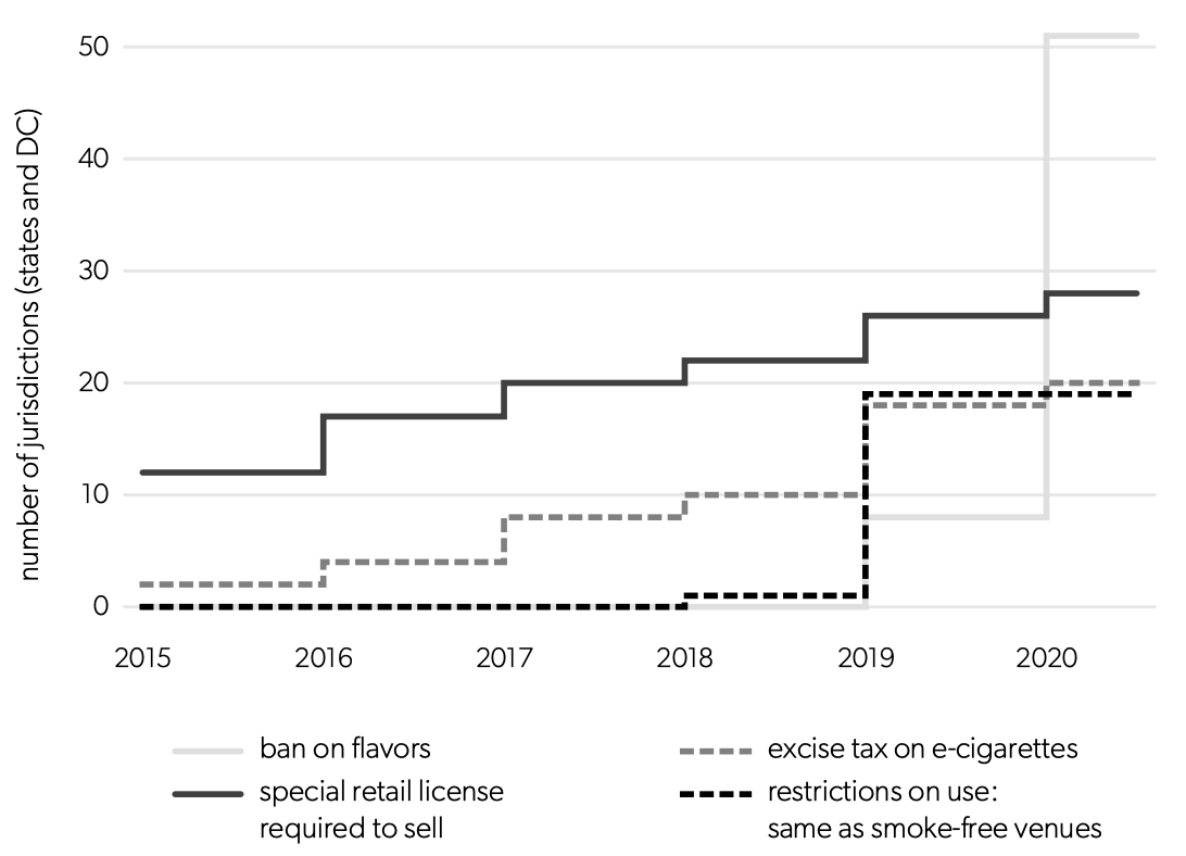 Sources: Tobacco Control Legal Consortium, U.S. E-cigarette regulation: a 50-state review, 2020. Available from https://publichealthlawcenter.org/resources/us-e-cigarette-regulations-50-state-review.