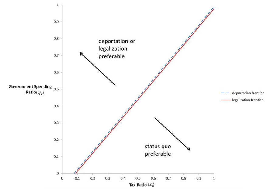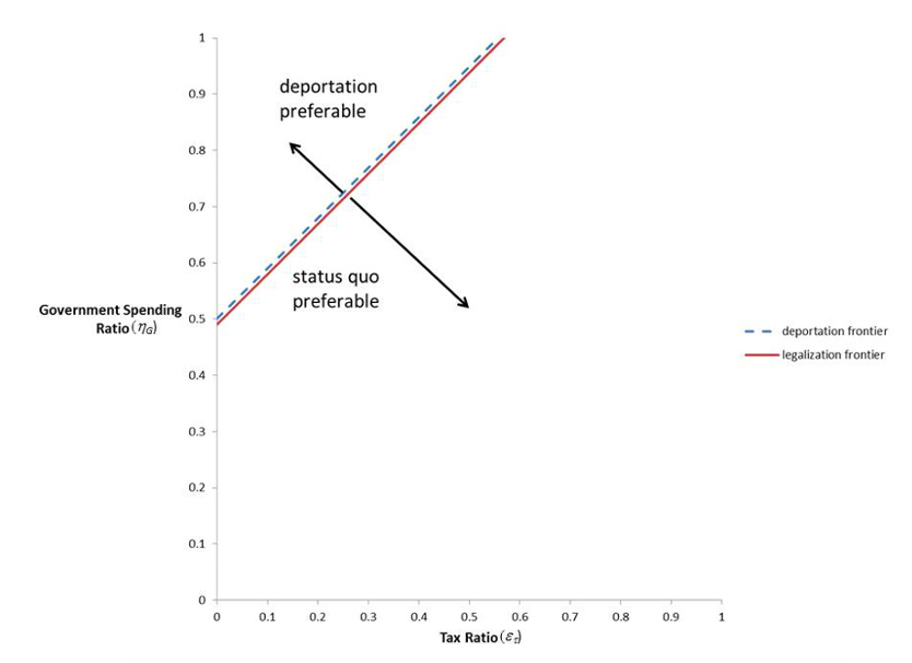 Regardless of any parameter uncertainty, another notable feature of figure 1 is that the legalization frontier is always below the deportation frontier. In other words, regardless of the amount of taxes paid or public services consumed by illegal immigrants, any welfare gain from legalizing them would be at least as high as the welfare gain from deporting them. Thus, the analysis in this paper suggests that deportation will always trail behind the status quo or legalization. Deportation will never be the best policy option.