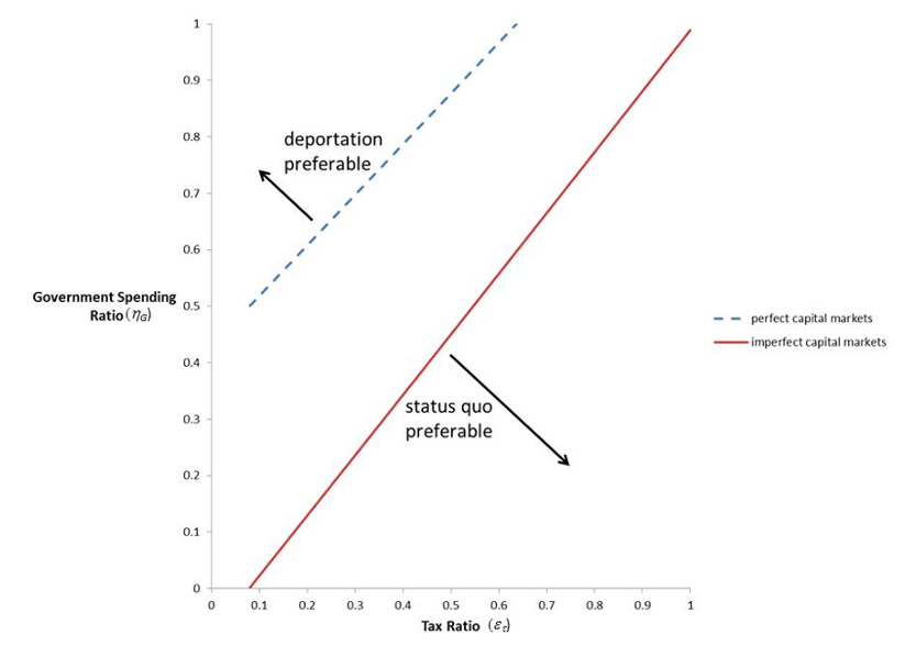 Nevertheless, the effect of illegal immigrants on interest rates has a much smaller effect on negative welfare than the effect of illegal immigrants on taxes. Overall, figure 4 demonstrates that introducing this capital market imperfection increases the region of the parameter space for which mass deportation would be desirable to natives relative to the status quo. In this regime, the optimal policy will be very sensitive to the parameters and