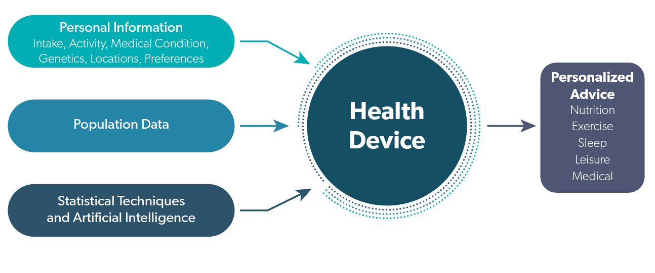 Personalized health devices will take all of the intakes, medical conditions, locations, activities and preferences for individuals and will combine that information with information on diet/disease relationships using population data and new statistical techniques to generate personalized advice.