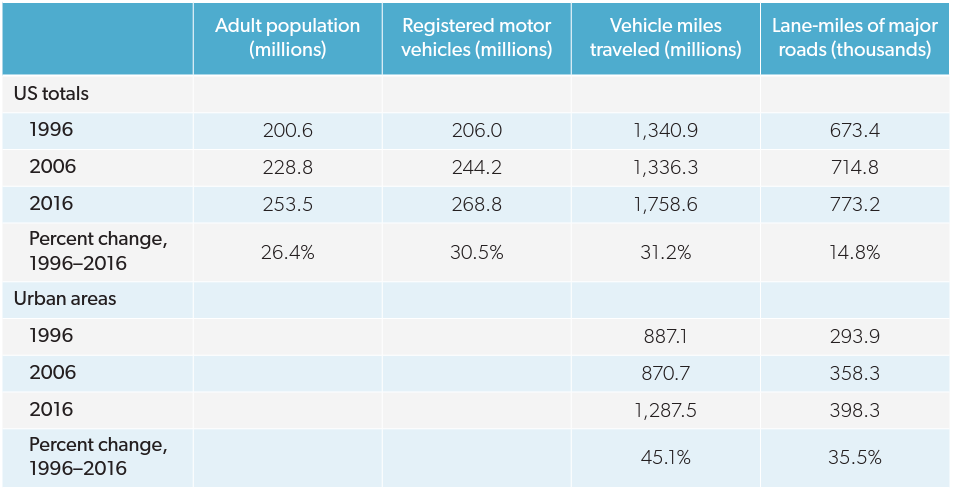 Sources: Federal Reserve Bank of St. Louis, “Population,” FRED, accessed January 26, 2019, https://fred.stlouisfed.org/categories/104; Registered Motor-Vehicles Table MV-1, Vehicle Miles Traveled Tables VM-2 and HM-44, and Lane-Miles of Major Roads Tables HM-20 and HM-60 from the 1996, 2006, and 2016 issues of Federal Highway Statistics, https://www.fhwa.dot.gov/policyinformation/statistics.cfm.