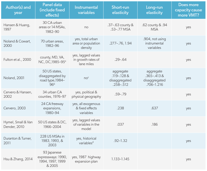 This section includes results from key studies that have empirically examined the relationship between highway capacity and vehicle miles traveled. Only panel data studies are included, because they provide more reliable results.