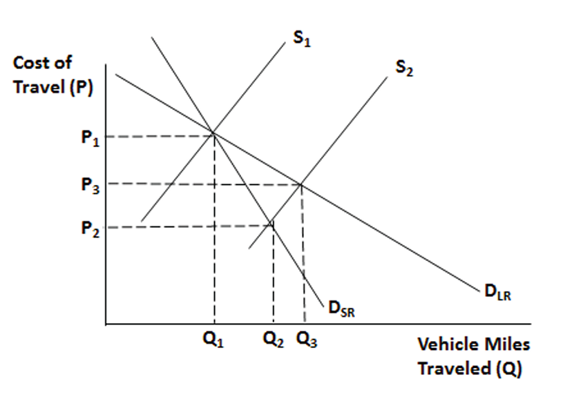 Price P1 and quantity Q1 represent the initial congested highway’s equilibrium. When highway capacity is expanded, the supply curve shifts from S1 to S2 , lowering the cost of using the highway. This results in a new short-run equilibrium at price P2 and quantity Q2 . The change in quantity demanded from Q1 to Q2 represents the short-run induced travel (induced demand) from highway expansion. The behavioral adjustment of travelers resulting from the lower travel cost is larger in the long run. This can be observed by examining the adjustment along the long-run demand curve. In this case, the induced long-run quantity demanded equals the change from Q1 to Q3.15As will be discussed later, the empirical research finds larger changes in the long-run than in the short-run adjustment. Because the traffic volume is larger and speeds are lower as time passes and people have time to adjust, the price of traveling on the highway is higher at the new long-run equilibrium (P3) than at the new short-run equilibrium (P2).
