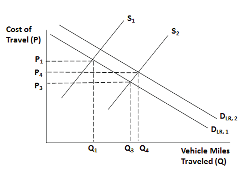 Figure 4 is much like figure 3, except that the analysis only uses a long-run demand curve. The initial equilibrium is at price P1, quantity Q1 . The figure also shows the long-run equilibrium price P3 and quantity Q3 from figure 3. The same highway capacity expansion is captured by shifting the supply curve from S1 to S2 , as in figure 3. However, in this case, simultaneous economic growth causes the demand curve to shift from DLR, 1 to DLR, 2. The long-run equilibrium occurs at price P4 and quantity Q4 . While the total change in vehicle miles traveled on the highway equals Q4 minus Q1 , the induced quantity demanded from highway capacity expansion equals the smaller quantity Q3 minus Q1 . The difference Q4 minus Q3 represents the additional vehicle miles traveled on the highway owing to economic growth. Researchers must control for the growth in demand factors that increases vehicle miles traveled on a highway, or they will overstate the size of the induced quantity demanded.