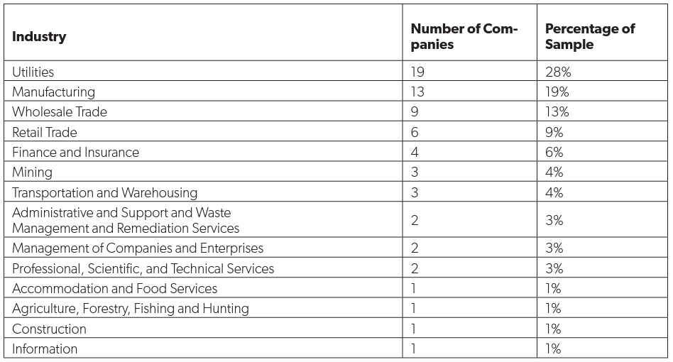There was also a wide range of industries represented by the 67 companies (as determined by NAICS codes), the most common being utilities (28 percent), manufacturing (19 percent) and wholesale trade (13 percent). A full industry breakdown is provided in table 1.