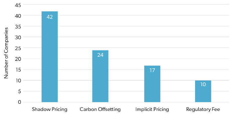 Figure 1 reports on the different carbon pricing methods that companies are utilizing as part of their internal carbon pricing strategies, including implicit prices, shadow prices and carbon offsetting and regulatory fees.