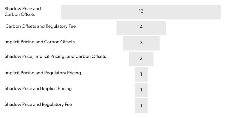 Shadow pricing dominates the methods most referenced in the CDP reports. Figure 2 examines the different combinations and frequencies of internal carbon pricing methodologies from the sample.
