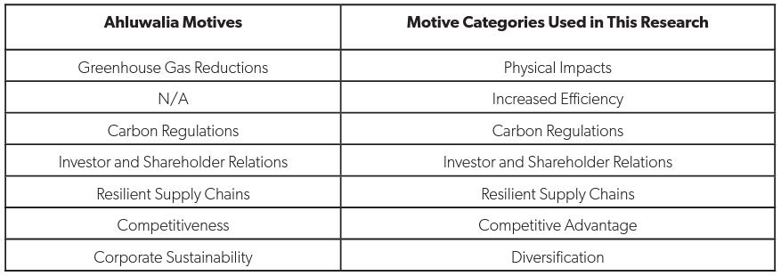 Just as companies differ in the methods they adopt for pricing carbon internally, the motives they offer for doing so differ markedly. Company motives are analyzed by responses to question CC2.2a of the CDP reporting template.122 The survey prompt for that section of the report is: “Please describe the process of how climate change is integrated into your business strategy and any outcomes of this process.” Again, the work of Ahluwalia (2017) provides a useful benchmark in providing six potential motives for internal carbon pricing. The motives are greenhouse gas reduction, carbon regulations, investor and shareholder relations, resilient supply chains, competitiveness, and corporate sustainability. Individual CDP reports suggested motives similar to those identified by Ahluwalia (2017). After carefully reviewing summative content of the CDP report narratives, adjustments to categories were made to and align with the precise statements of internal pricing motives in section 2.2 of each CDP report.