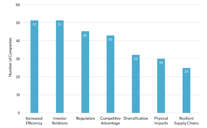 Investor relations and efficiency are the most common motives, followed closely by regulation and competitive advantage. As mentioned earlier, consumers are becoming increasingly sensitive to the environmental posturing of companies. This is likely animating greater investor interest in the market signals reflected in environmental reputation.