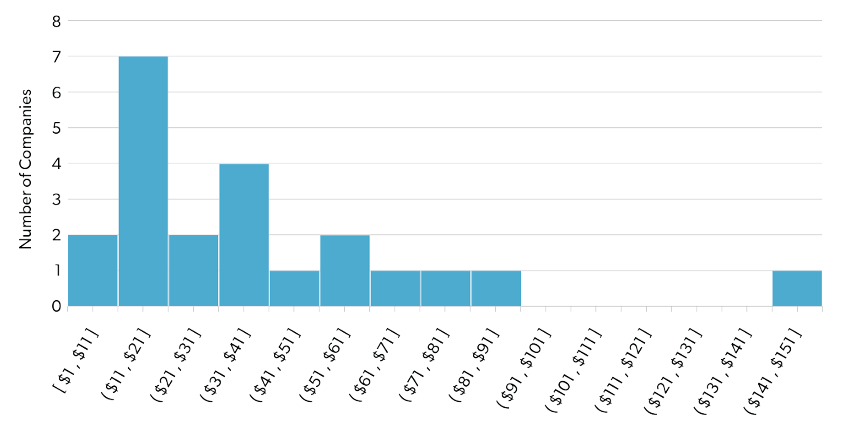 Of the 67 companies reporting use of an internal carbon price, only 22 disclosed a specific price in their CDP documentation. Figure 5 reports on the range of reported carbon prices across those 22 companies. It is interesting to note that companies are using a wide range of carbon prices as part of their strategic decision-making processes. This may be a reflection of the underlying uncertainty associated with various carbon price modeling approaches, independently revealed market prices for carbon, and individually determined risk factors. Reported prices range from $1 to $150 per ton, with an average price of $40.09 and a median price of $32.83.