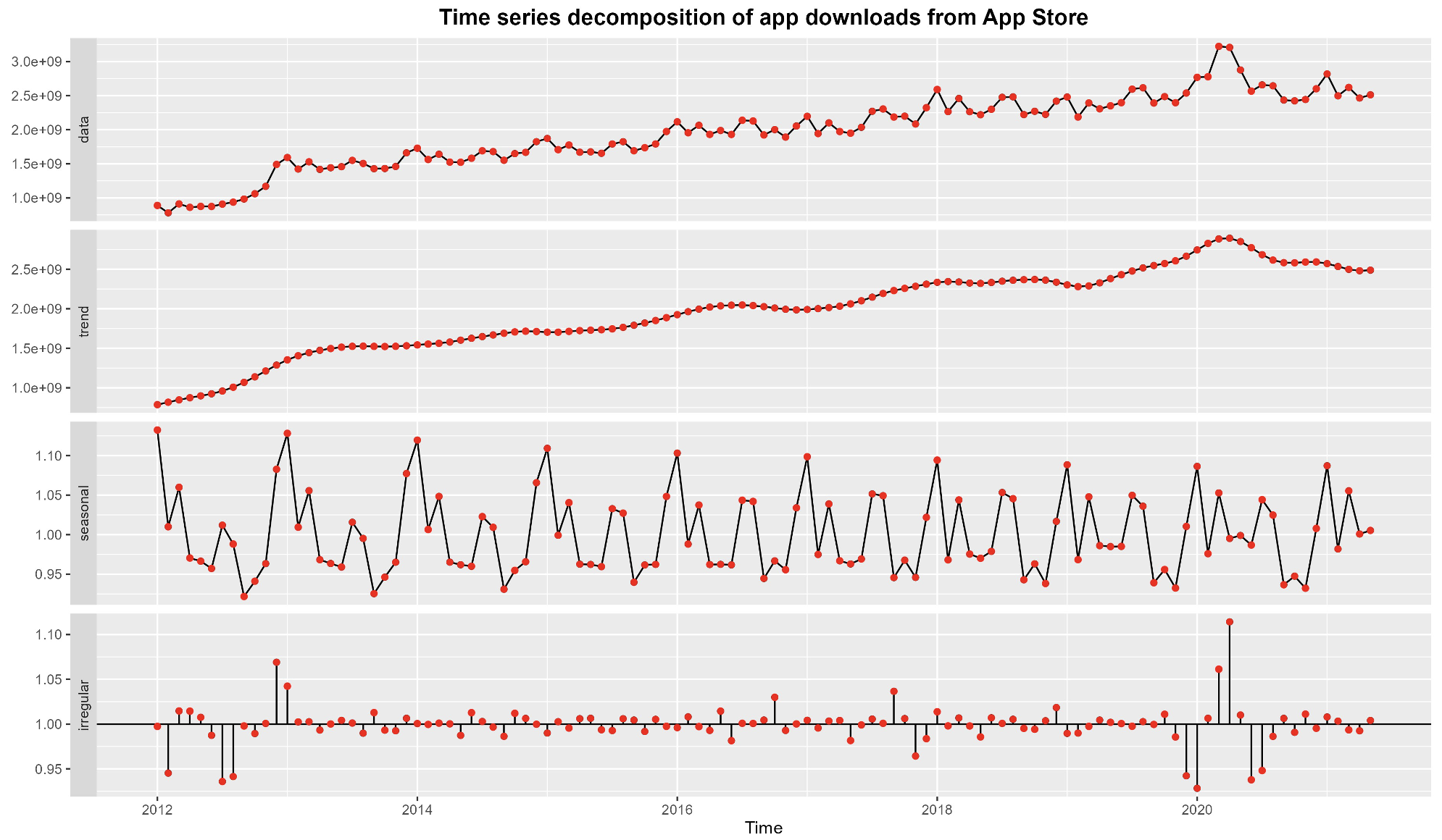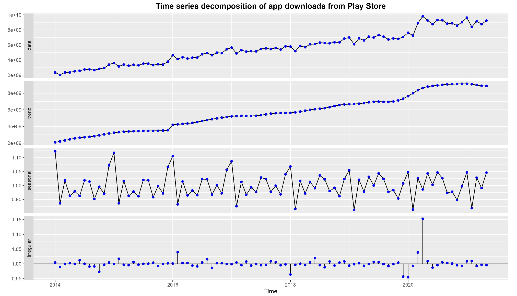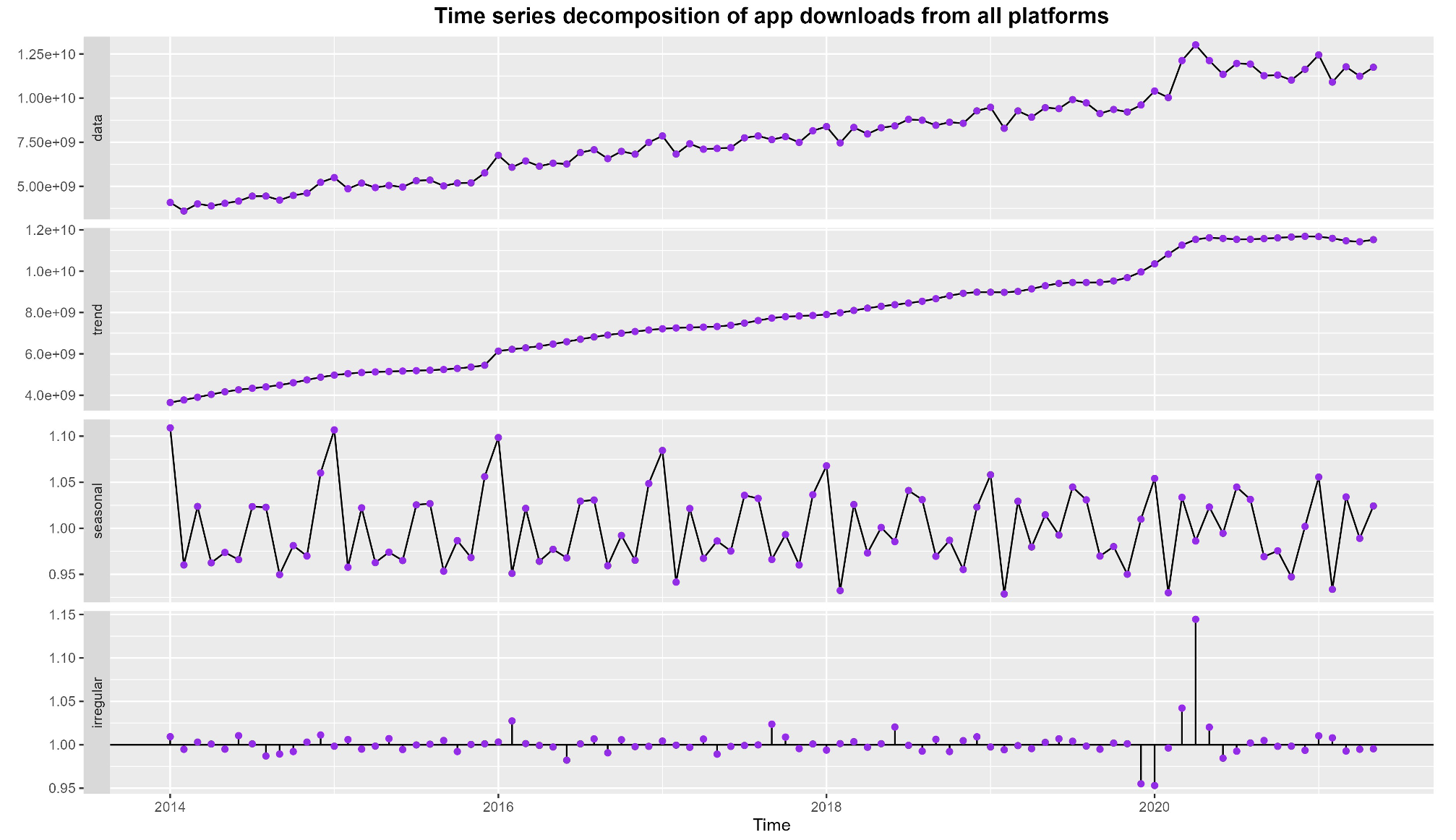 Seasonal patterns reveal that the number of downloads tends to be higher in January and December for both platforms, probably reflecting a holiday effect. The month(s) with a lower-than-usual number of downloads depends on the platform: for Google that month is February, and for Apple, the months are September–November. September–November months are also low for Google, but not as low as February. The positive effect of the pandemic on downloads is clearly visible in the irregular series, which is the fourth panel in each graph. On aggregate, the number of downloads in April 2020 was 15% higher than would have been expected.