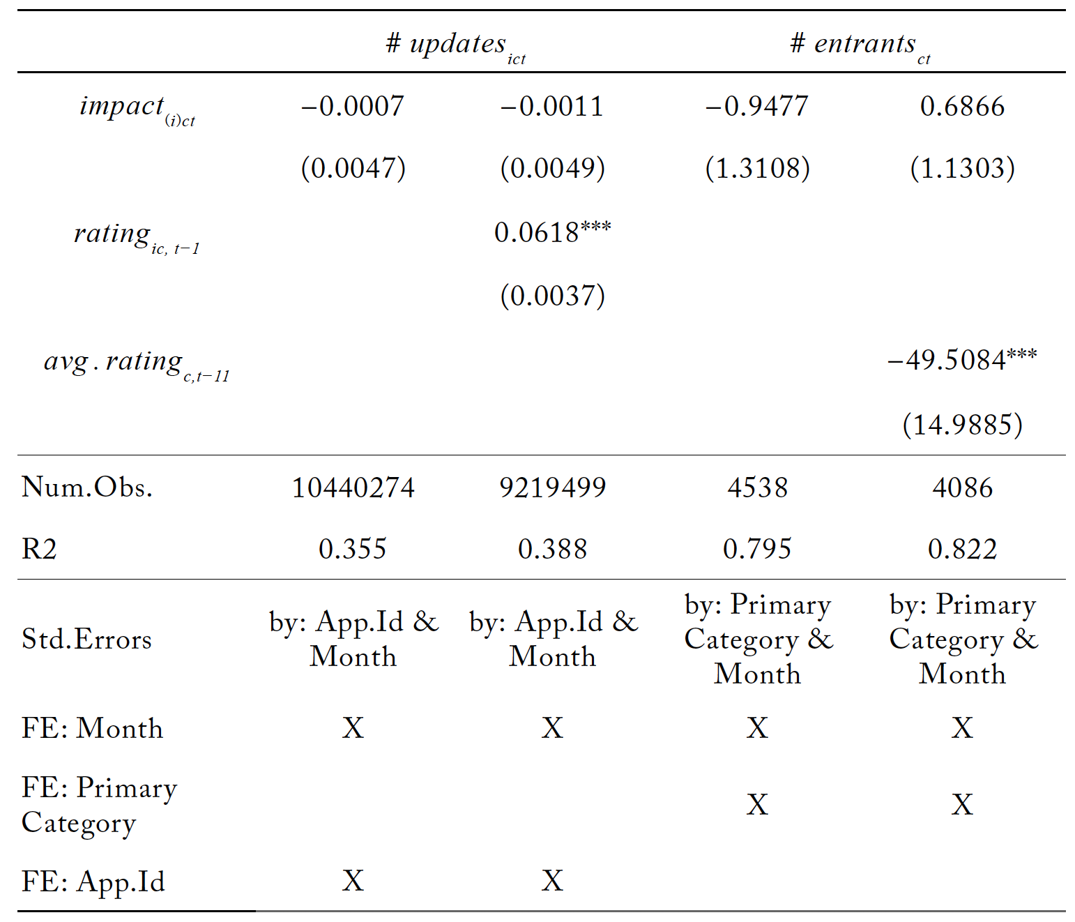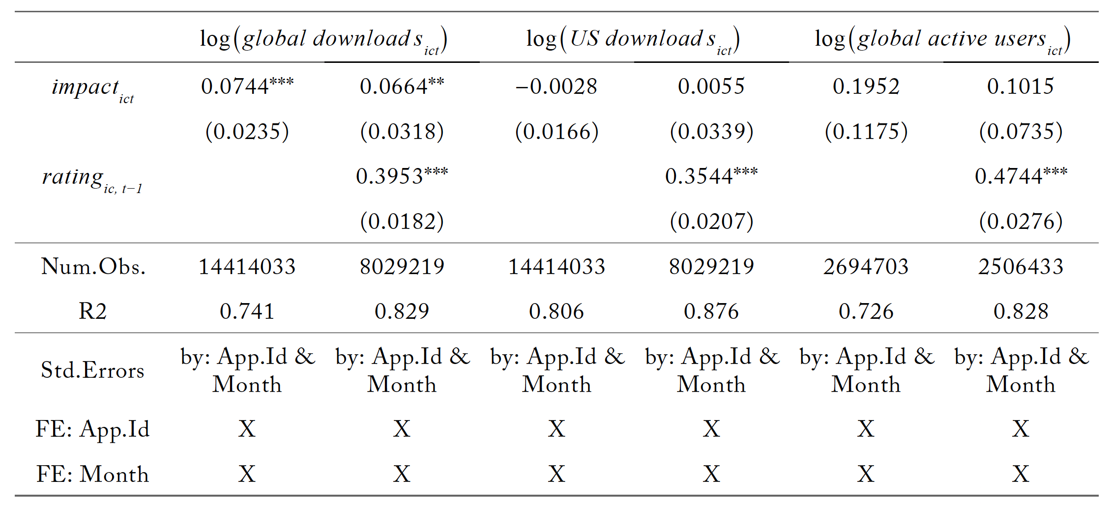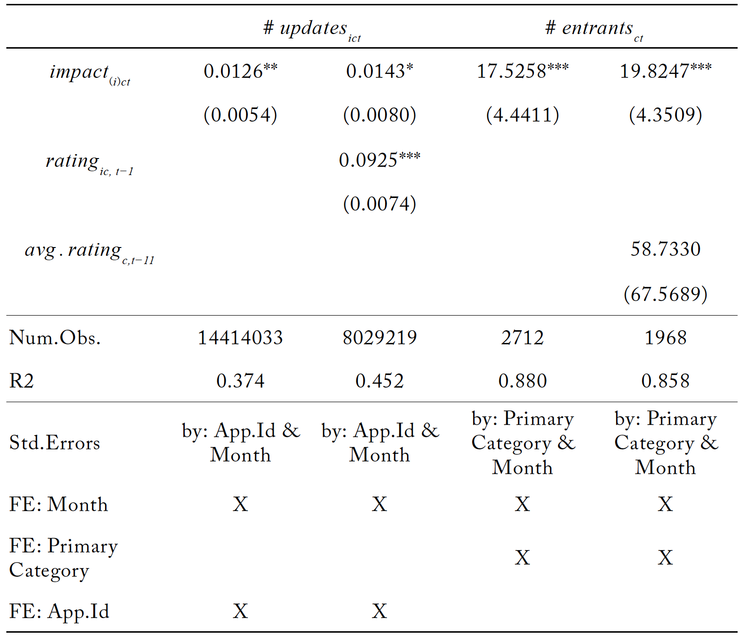 for regressions on global number of downloads, US number of downloads, monthly active users, and number of monthly updates. For regression on number of new apps in a category, we use average ratings rather than app-specific ratings as the control variable because the dependent variable is measured at the category level, not the app level.