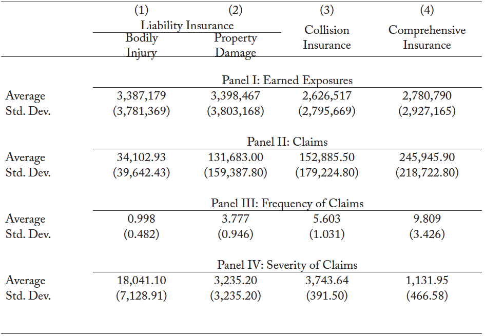 Source: National Association of Insurance Commissioners Auto Insurance Database Reports 2010, 2013, 2017, 2018. Note: The dependent variable in Panel I is the natural log of the number of insurance claims, in Panel II the natural log of the frequency of claims (total number of claims divided by exposures), and in Panel III the natural log of the real value of the severity of these claims. Column (1) examines the bodily injury component of liability insurance, column (2) the property damage component of liability insurance, column (3) collision insurance, and column (4) comprehensive insurance. Each column includes the full set of controls from Table 3. The sample period is 2008–2015. Standard errors, shown in parentheses, are clustered at the state level. *** p<0.01, ** p<0.05, * p<0.10
