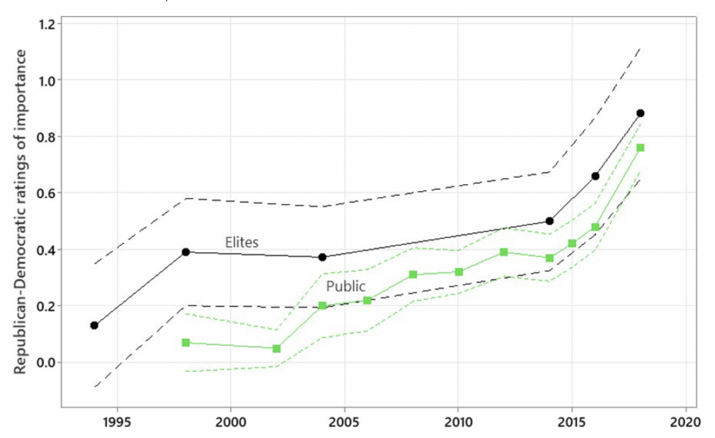 Figures 3 and 4 show that partisan differences increased among both elites and the public. Figure 5 highlights this point by showing the size of the gap between Democrats and Republicans in elites and the public. It is consistently larger among elites, but there is a strong upward trend in both groups. The growth seems to have accelerated in recent years: in the public, the partisan difference doubled between 2014 and 2018.