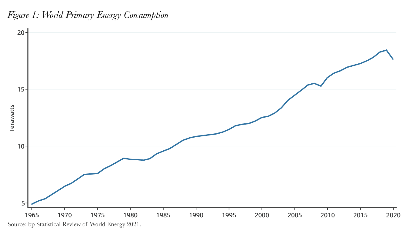 How should we define superabundance? Any definition will be somewhat arbitrary. In 2019, humanity consumed 581.5 exajoules of primary energy.3Statistical Review of World Energy (BP, 2021), 70th edition, https://www.bp.com/content/dam/bp/business-sites/en/global/corporate/pdfs/energy-economics/statistical-review/bp-stats-review-2021-full-report.pdf. Primary energy is energy in raw form, before conversion through any human process. Electricity is considered to be secondary energy, and the fuel that is used to generate it is considered primary energy. For forms of electricity that are not generated via fossil fuels, BP and other organizations that track energy statistics impute primary energy based on a conversion factor equivalent to the rate at which fossil fuels generate electricity. “Updated Methodology for Converting Non-fossil Electricity Generation to Primary Energy,” BP.com, accessed November 22, 2021, https://www.bp.com/content/dam/bp/business-sites/en/global/corporate/pdfs/energy-economics/statistical-review/bp-stats-review-2021-methodology-for-converting-non-fossil-fuel-primary-energy.pdf. If continually drawn at a constant rate, this annual energy consumption is equal to 18.4 terawatts of power, or 2.4 kilowatts (kW) per person. In the United States, Americans consumed 94.90 exajoules for a continuous rate of 3.0 terawatts, or 9.2 kW/person.4“BP Statistical Review of World Energy.” According to the US Energy Information Administration, the United States consumed 105.8 exajoules, a continuous rate of 3.4 terawatts, or 10.2 kW/person. “Monthly Energy Review,” US Energy Information Administration, August 26, 2021, https://www.eia.gov/totalenergy/data/monthly/index.php. In 1979, the United States consumed 10.8 kW/person, 18 percent more than it does today;5“BP Statistical Review of World Energy.” According to the Energy Information Administration, 12.0 kW/person. US Energy Information Administration, “Monthly Energy Review.” this decline broadly corresponds with the period Tyler Cowen has called the Great Stagnation.6Tyler Cowen, The Great Stagnation: How America Ate All the Low-Hanging Fruit of Modern History, Got Sick, and Will (Eventually) Feel Better: A Penguin eSpecial from Dutton (Penguin Group US, 2011). Iceland consumed 20.5 kW/person in 2019, over twice US consumption, while Qatar topped the chart with 21.6.7“BP Statistical Review.” If we wanted the entire planet to achieve Iceland-level energy use, this would require going from 18.4 terawatts to 158 terawatts of continuous power output, nearly an order-of-magnitude increase. This is about the rate of increase in human primary energy consumption over the last century, which has corresponded with rapid economic growth and higher living standards. Yet even this step forward in energy consumption would merely bring the rest of the world to where Iceland was in 2019. As a working definition, we consider a society to have superabundant energy if it consumes 40 kW/person, about twice Iceland’s continuous power draw (see figures 1 and 2).