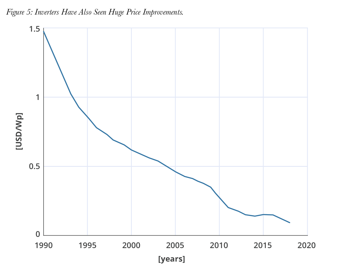 Inverters convert power between alternating current (AC) and direct current (DC). They are required since motors typically run on AC but batteries store electricity in DC. Inverters have seen an order-of-magnitude price decrease over the last 20 years (see figure 5). Inverters are more efficient as well. Tesla Motors pioneered the use of silicon carbide inverters, which can be 99+ percent efficient. These new designs are spreading rapidly to other cars, planes, and e-bikes.