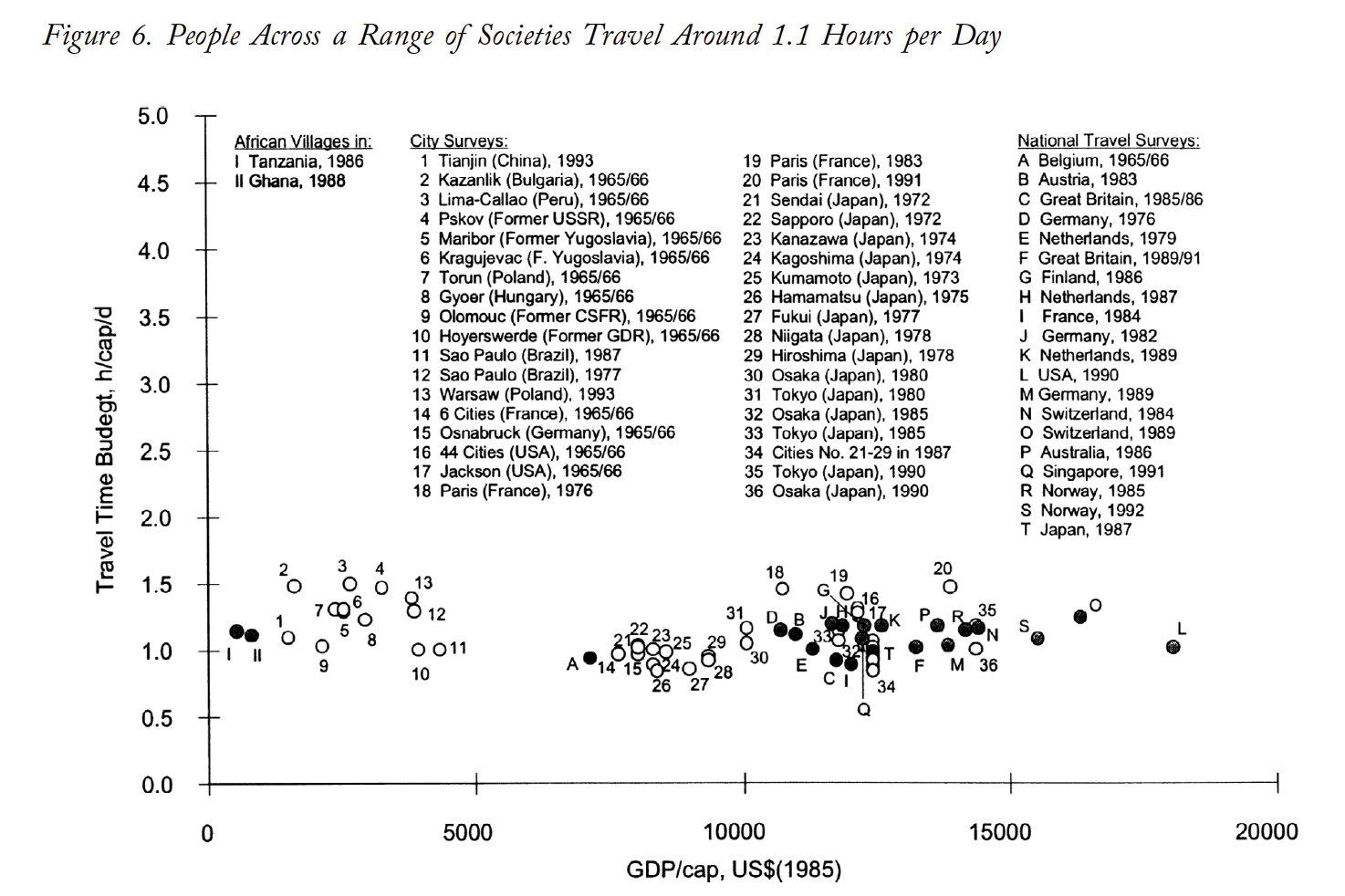 In 1979, transportation engineer Yacov Zahavi proposed that people behave as if they have nearly fixed travel budgets for both money and time.17Yacov Zahavi, The “UMOT” Project (US Department of Transportation, August 1979). Given a variety of transport modes with different speeds and costs, travelers act as if they “solve” an optimization problem to maximize their spatial and economic opportunities. He found that daily travel times averaged from just above 1 to 1.5 hours per day, with an asymptote around 1.1 hours per day as higher-speed travel options became available. As a result, further increases in transport speed don’t serve to save time; they simply make more spatial and economic opportunities available. This finding was picked up by Italian physicist Cesare Marchetti, who used a wide range of anthropological evidence to show that travel time in human societies has always averaged about 1 hour per day.18C. Marchetti, “Anthropological Invariants in Travel Behavior,” Technological Forecasting and Social Change 47, no. 1 (1994): 75–88. Since then, 1.1 hours has become known as Marchetti’s constant (see figure 6).