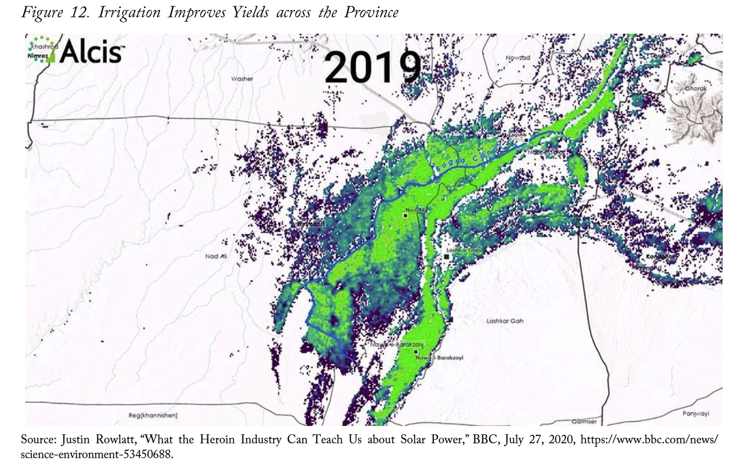 Solar panels are already making an impact in many countries (see figures 11 through 13). Solar installation is within the capacity of even the smallest economies. Scale varies from giant farms to powering a single light. Maintenance is much simpler than for generators, allowing longer product lifetimes. One of the most striking applications is solar-powered water pumps for irrigation and cleaner drinking water. Water applications do not require batteries since water towers provide pressure, and irrigation can happen when it’s sunny outside.
