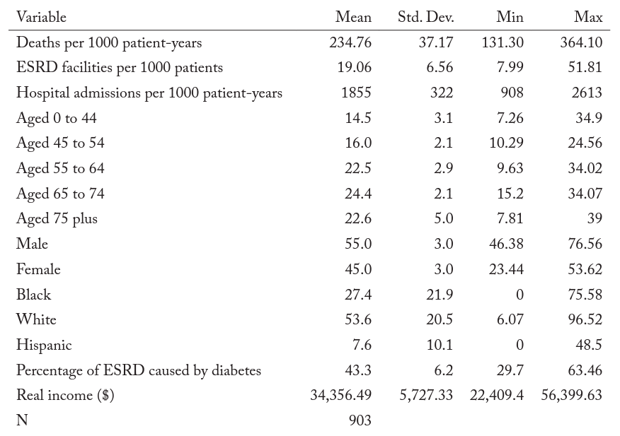 We excluded Georgia, Maryland, Massachusetts, Oregon, South Carolina, Texas, and Utah from our data. Each of these states, like New Jersey, has set (or previously set) staff-to-patient ratios during the sample period. After removing observations from these seven states and New Jersey, we were left with forty-two states. Table 2 presents the summary statistics for our sample. All three measures of hemodialysis-clinic quality vary substantially between states. The mean death rate per thousand patient years for hemodialysis patients in our sample was 234 and ranged from a low of 131 to a high of 364. The number of hemodialysis facilities per thousand patients was nineteen and ranged from eight to fifty-two. The hospital admittance rate per thousand patient years had a mean of 1,855, with a low of 908 and a high of 2,613. Nearly 70 percent of the hemodialysis patients in our sample were over the age of fifty-five. African Americans amounted to 27 percent of the hemodialysis patients in our sample. African Americans are overrepresented because they have a higher risk of health issues that result in kidney failure.2For more information, see https://www.kidney.org/news/newsroom/factsheets/African-Americans-and-CKD Diabetes was the cause of 43 percent of ESRD of the patients in our study, but in some states it was as high as 64 percent.